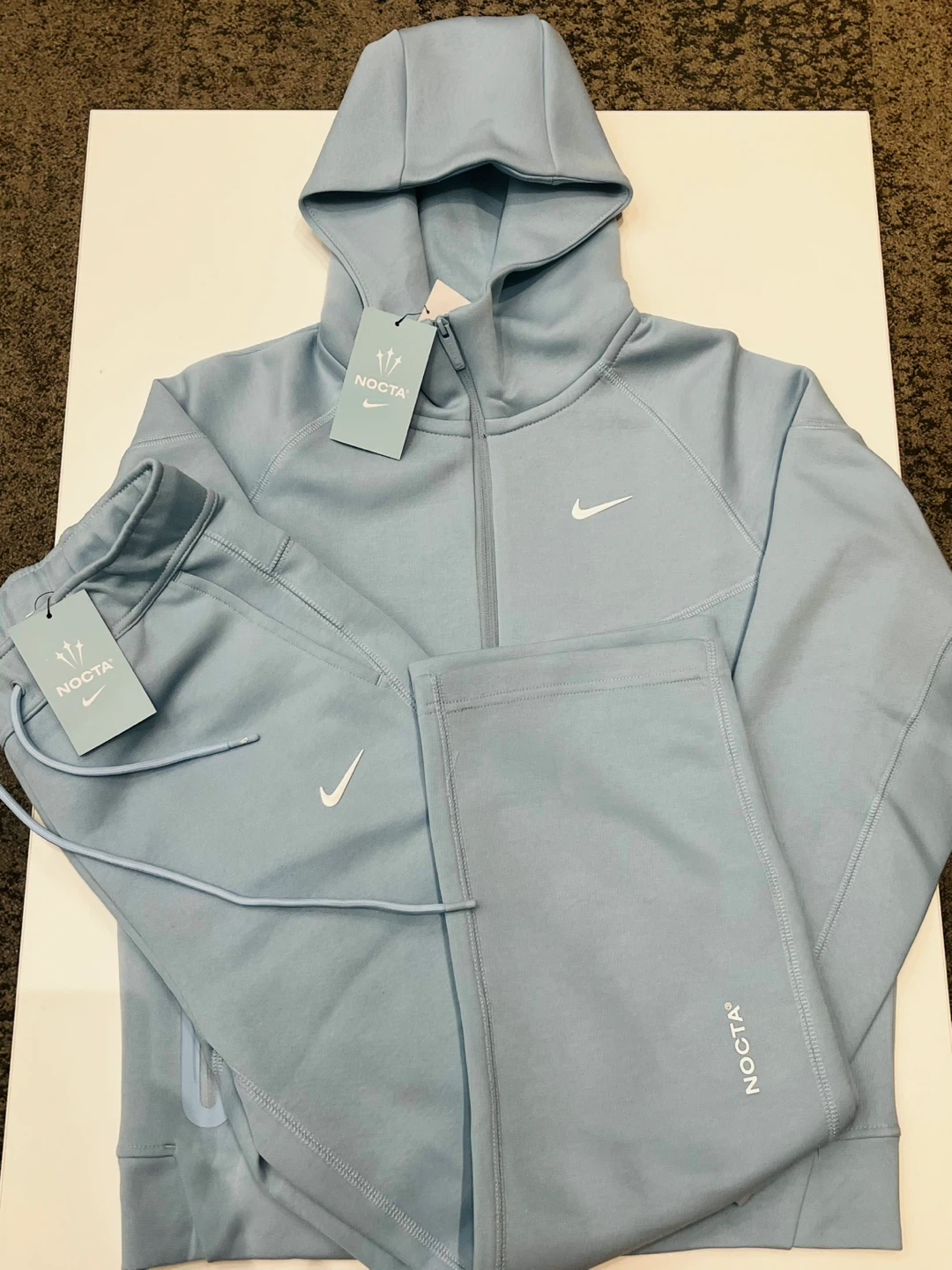 This is a Nike x NOCTA tracksuit set. It includes a zip-up hoodie and matching pants. The set is a light blue colour with white Nike and NOCTA branding.