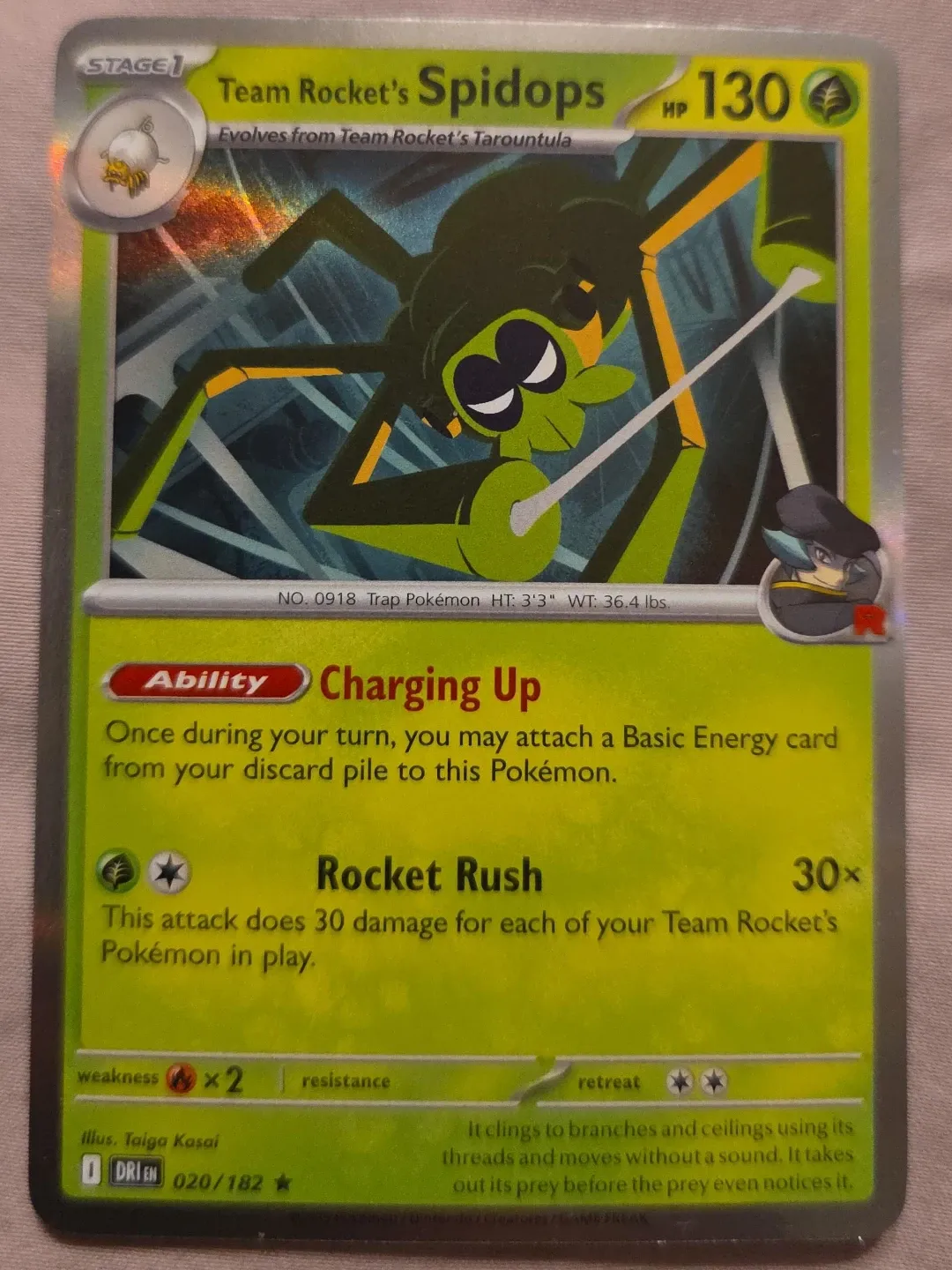 This is a Team Rocket's Spidops Pokémon card, number 020/182. It features the 'Charging Up' ability and the 'Rocket Rush' attack. The card details indicate it's a Trap Pokémon with a height of 3'3" and weight of 36.4 lbs.