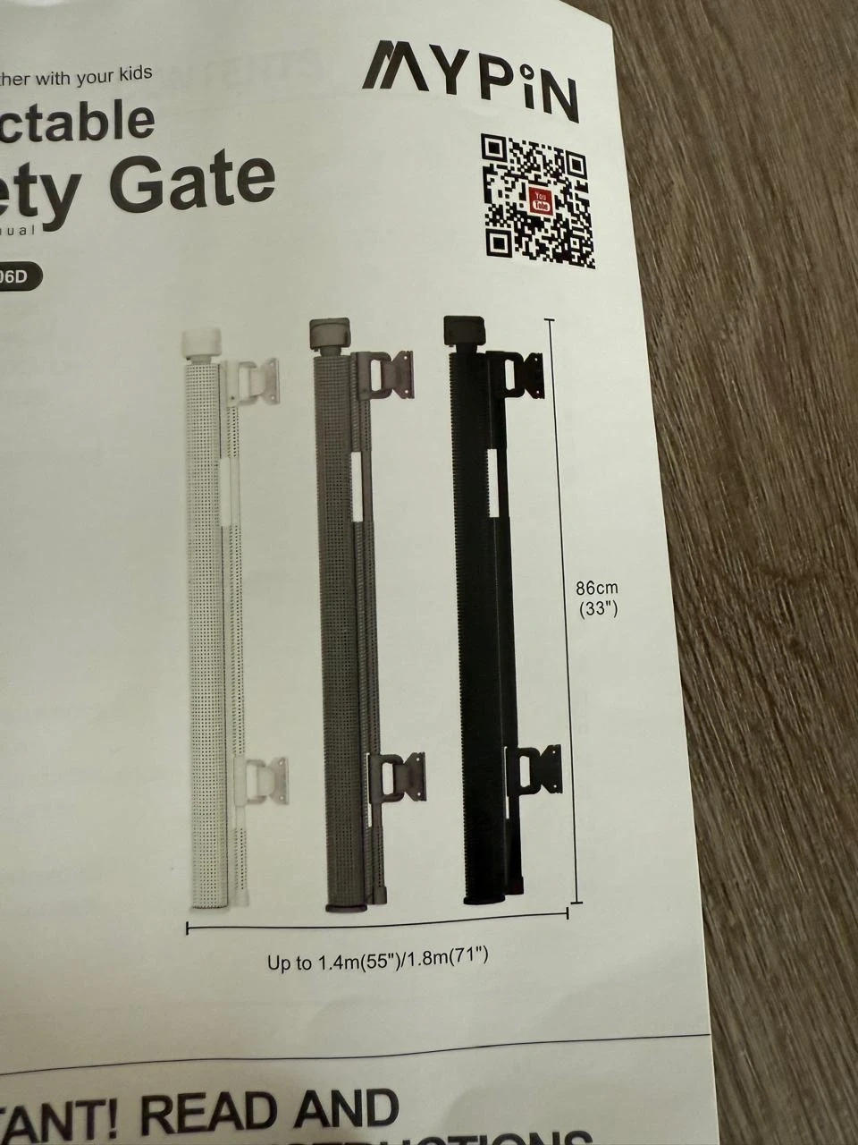This MYPIN retractable safety gate is designed for safety. It's 86cm (33") tall and extends up to 1.4m (55"). This gate is suitable for creating safe spaces for children.