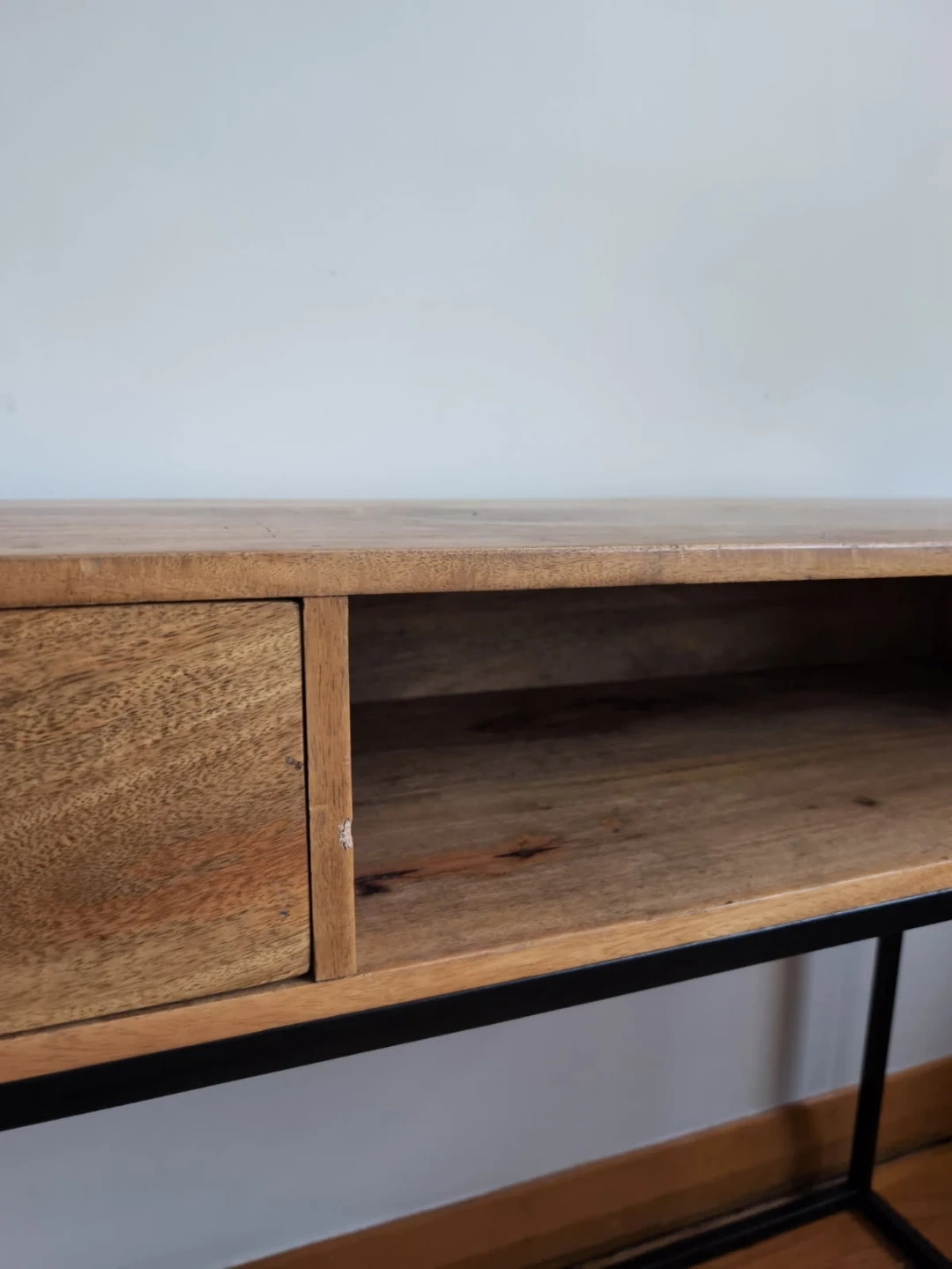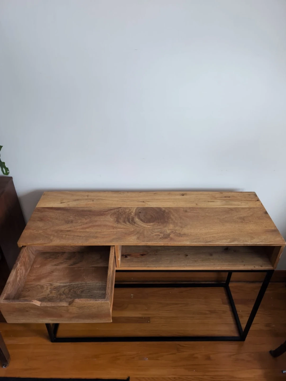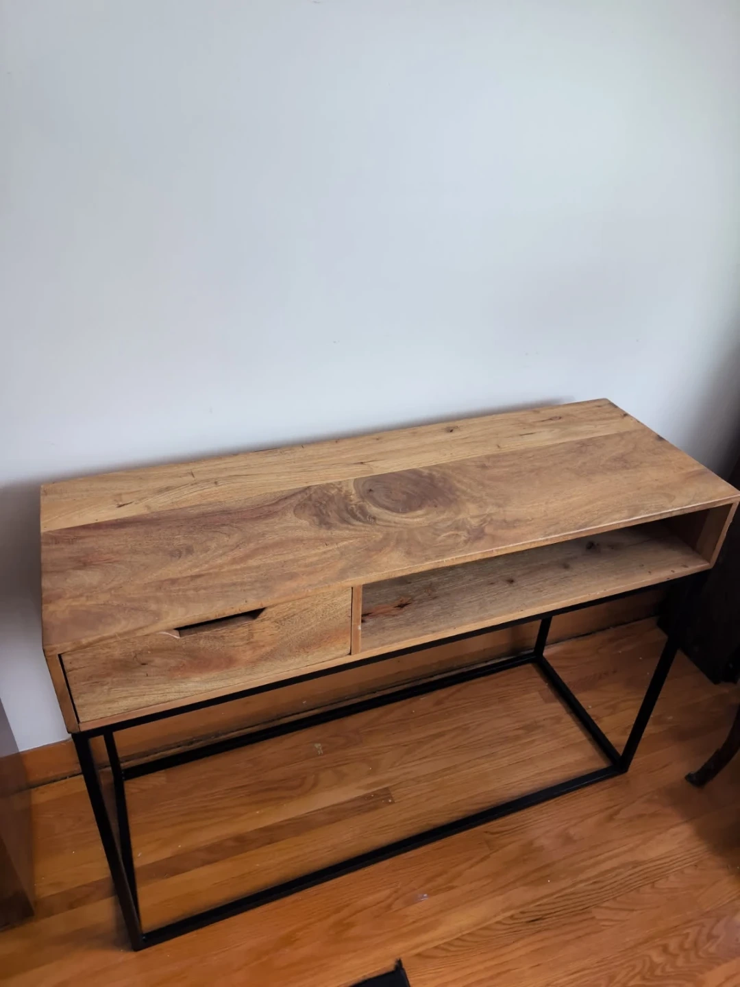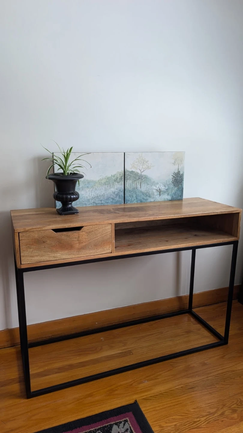 This console table features a stylish wood top with a sleek black metal frame, and includes a drawer for convenient storage. The table is in good condition and ready to add a touch of modern elegance to your entryway or living space. Note that it is a used item.