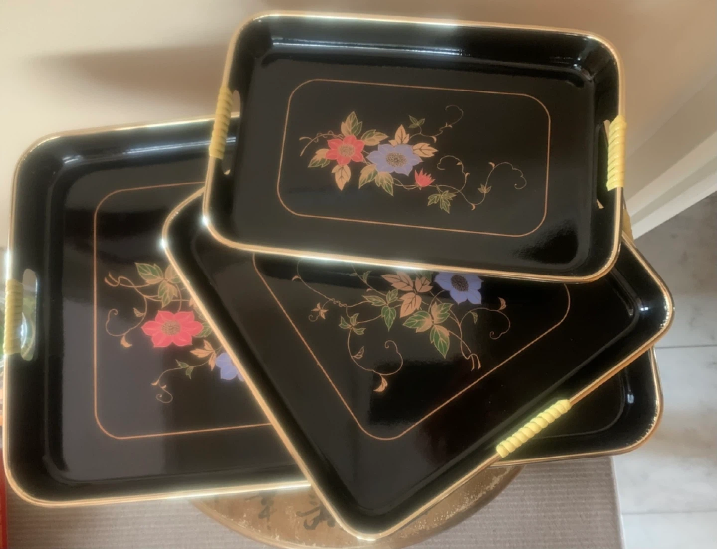 Vintage Black Lacquer Floral Serving Trays 3 PC Set
