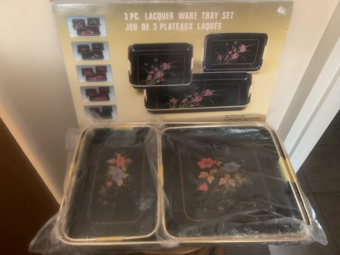 Vintage Shiny black lacquer tray set in box. Comes as a 3 piece set. Made in Japan for F.W. Woolworth Co.