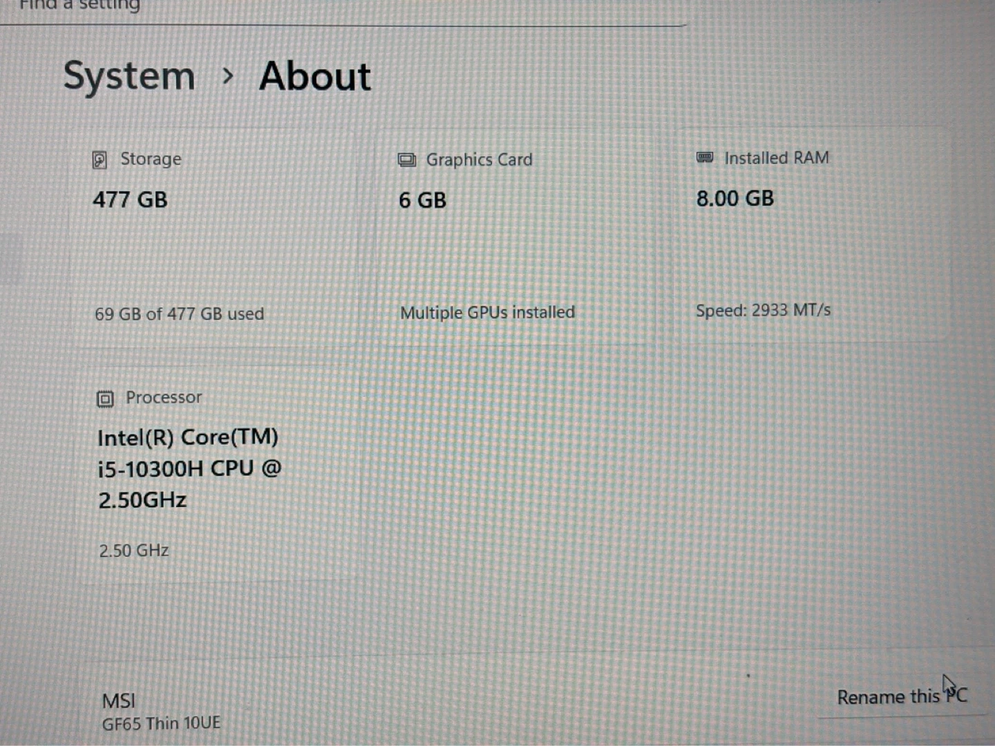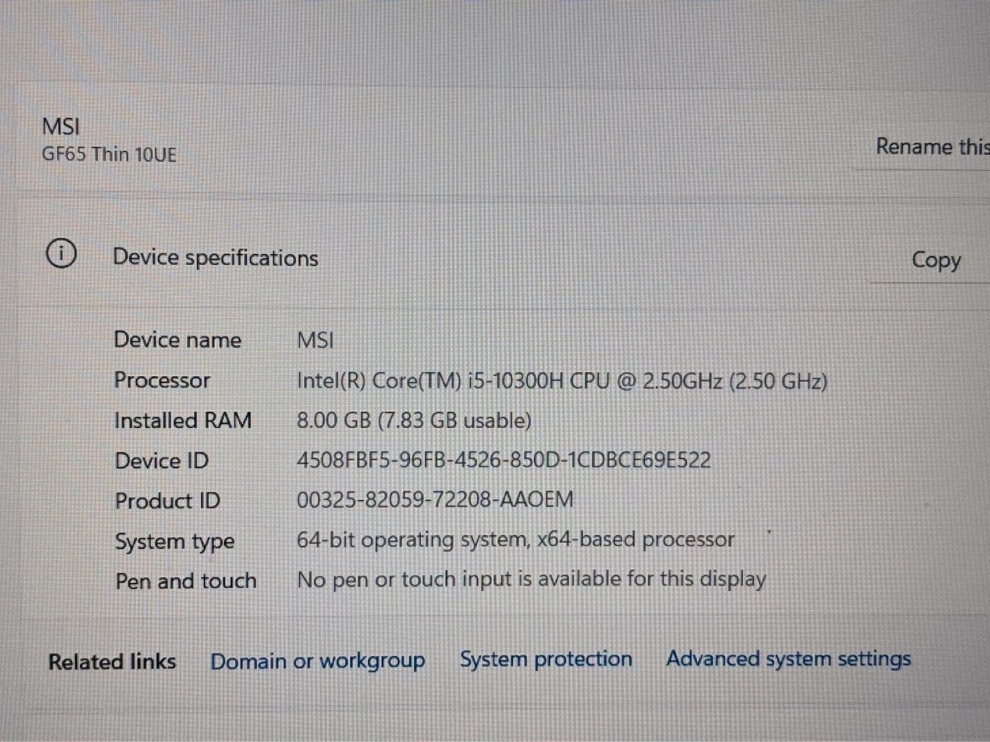 MSI GF65 Thin 10UE laptop with an Intel Core i5-10300H CPU and 8GB RAM. It features a GeForce RTX graphics card. Black finish with red backlit keyboard.