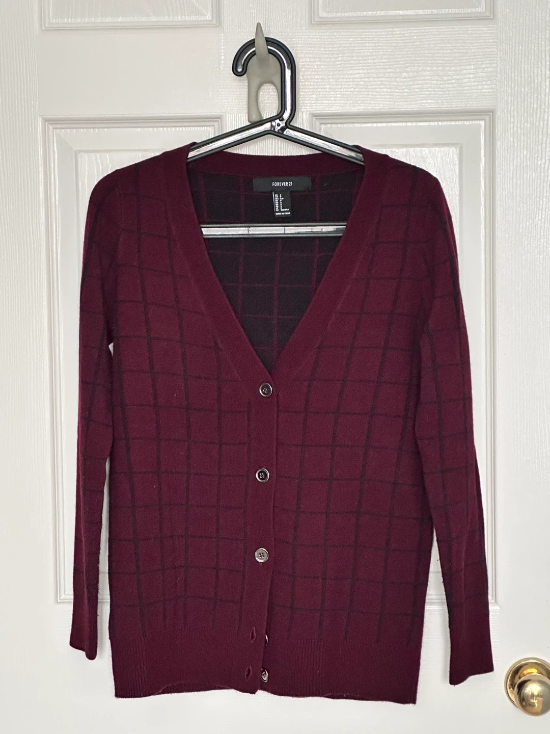 This is a burgundy Forever 21 cardigan with a plaid pattern. It features a V-neck and button-up closure. It's made with a soft knit material for comfort.