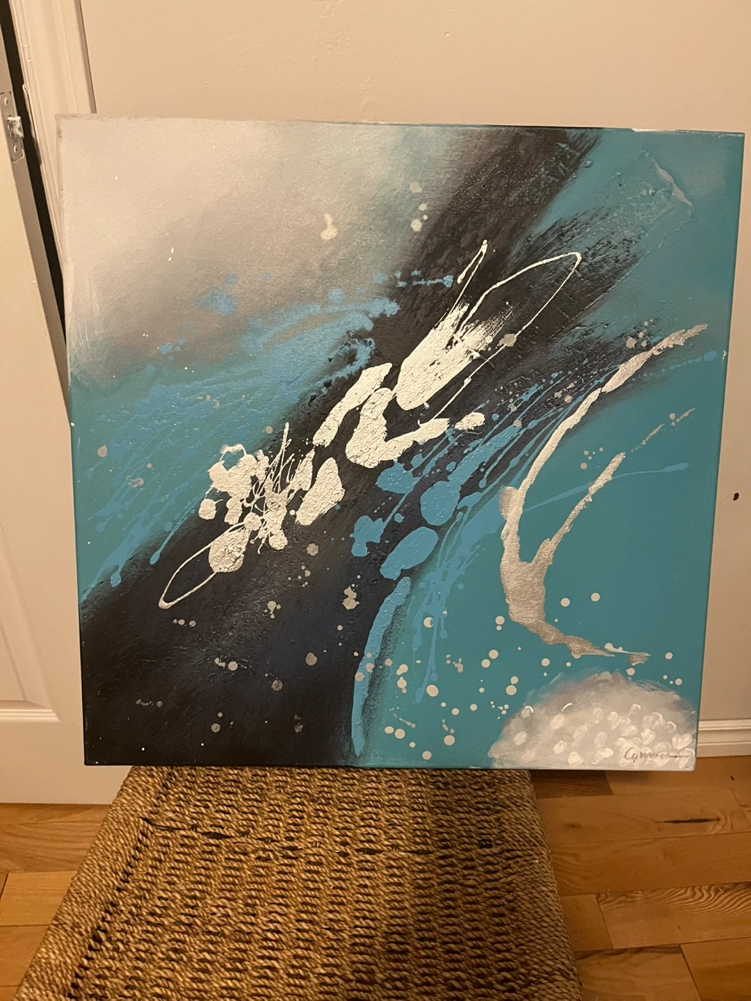 Add a touch of modern art to your space with this abstract canvas painting! The piece features a blend of turquoise, black, and silver, creating a dynamic and eye-catching design. Perfect for adding a pop of colour and interest to any room in your home. 24X24 inches