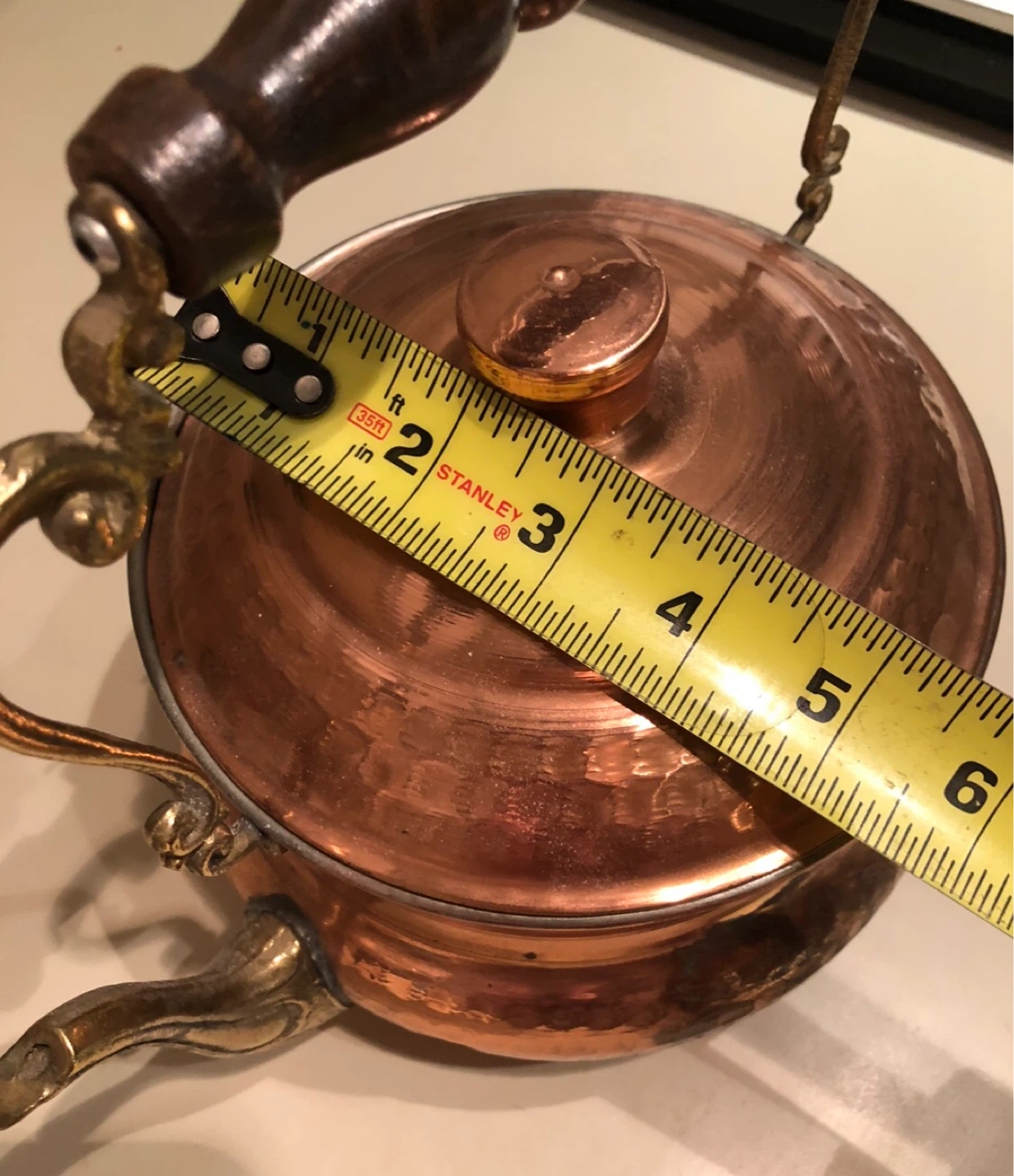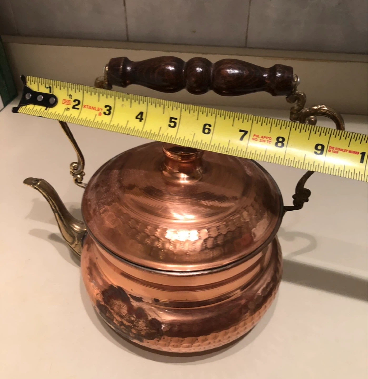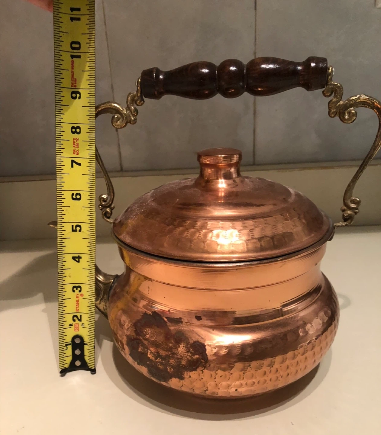Hammered copper kettle with a dark wooden handle and brass accents. It's approximately 8 inches tall to the top of the lid and 7 inches wide. Great for display or light use!