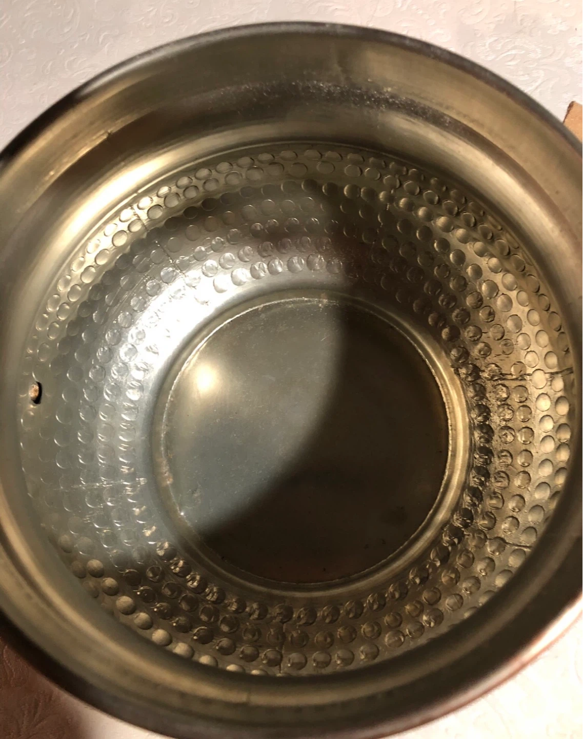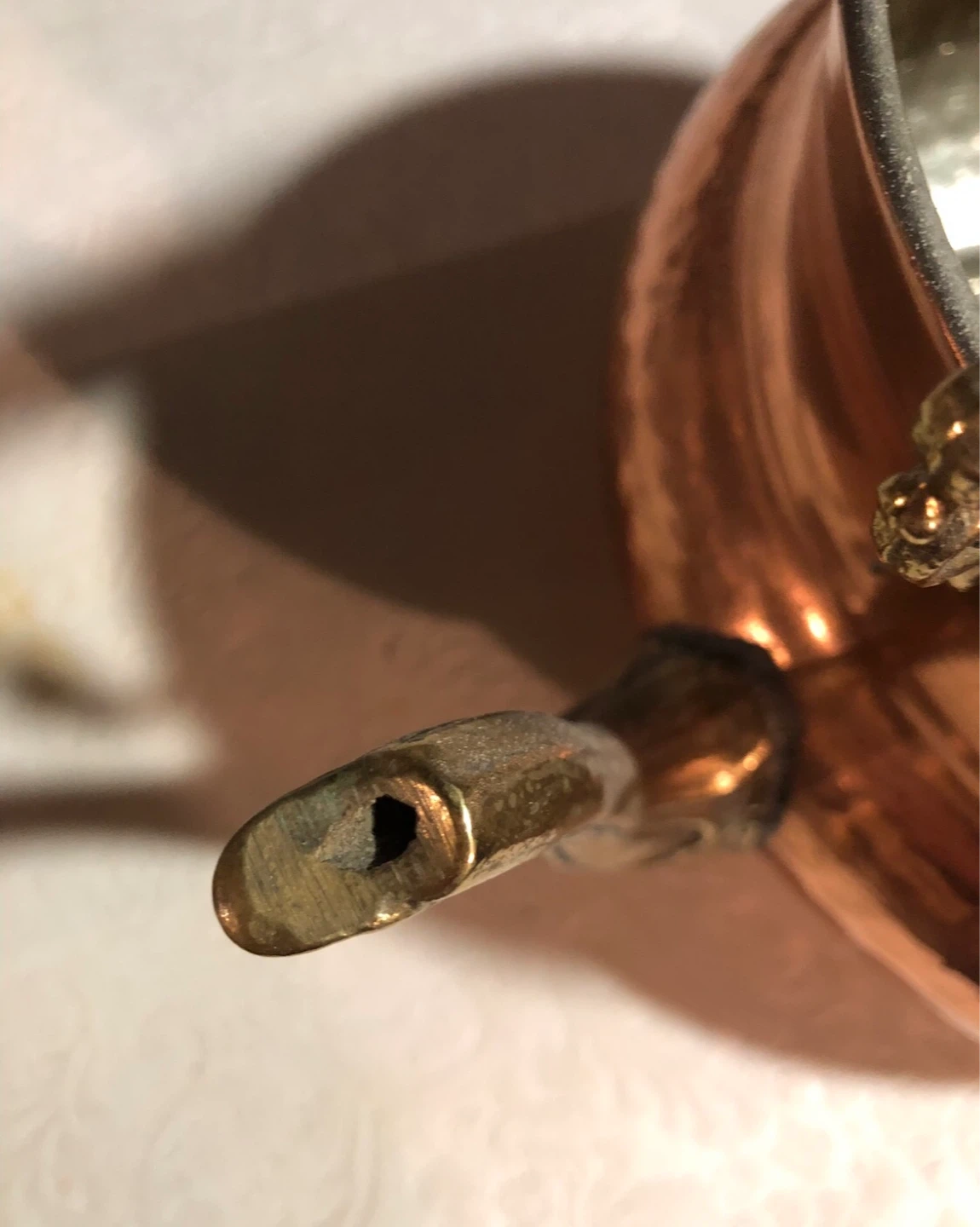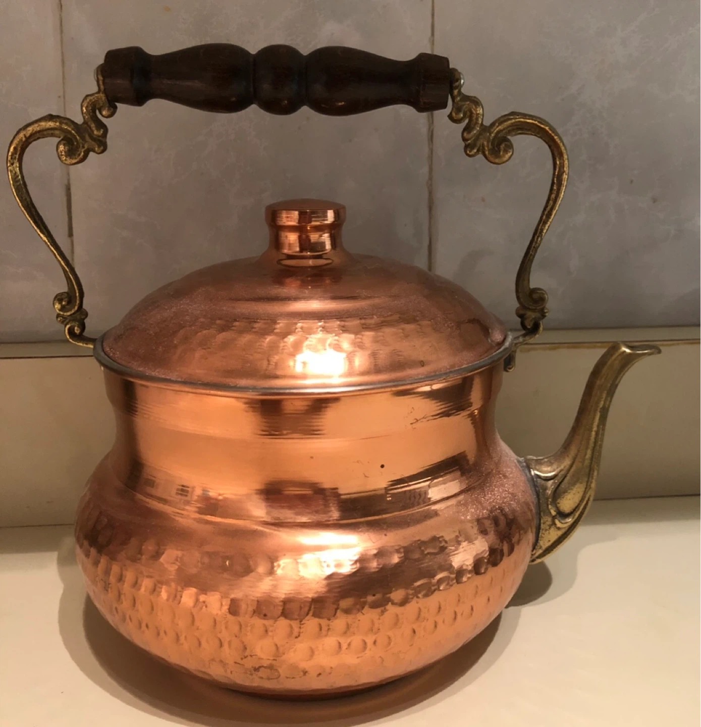 Hammered copper kettle with a dark wooden handle and brass accents. It's approximately 8 inches tall to the top of the lid and 7 inches wide. Great for display or light use!