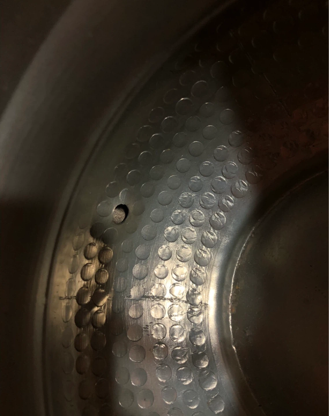 Hammered copper kettle with a dark wooden handle and brass accents. It's approximately 8 inches tall to the top of the lid and 7 inches wide. Great for display or light use!