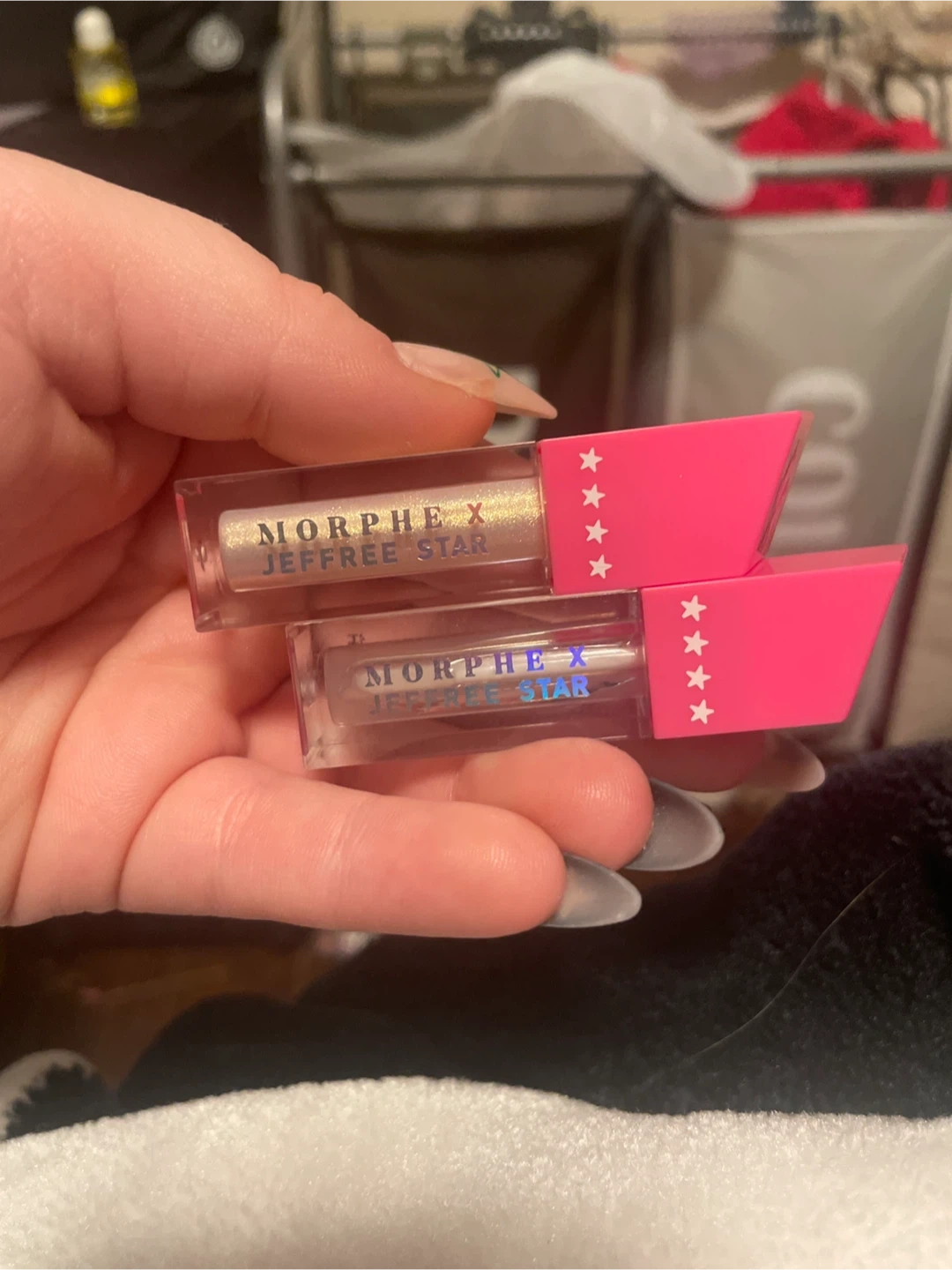 Two mini highlighters from the Morphe x Jeffree Star collection. These shimmer shades add a touch of sparkle. Ideal for makeup enthusiasts!