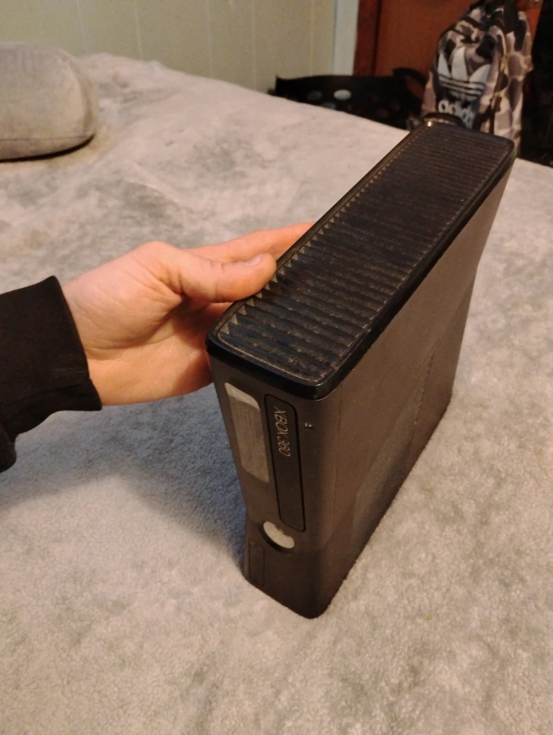 This is an Xbox 360 gaming console. It's black and has multiple ports on the back for connectivity. This console is ready for your game collection! No wires or controls included