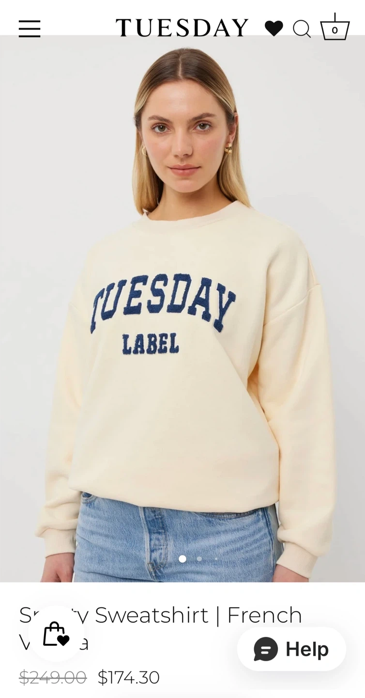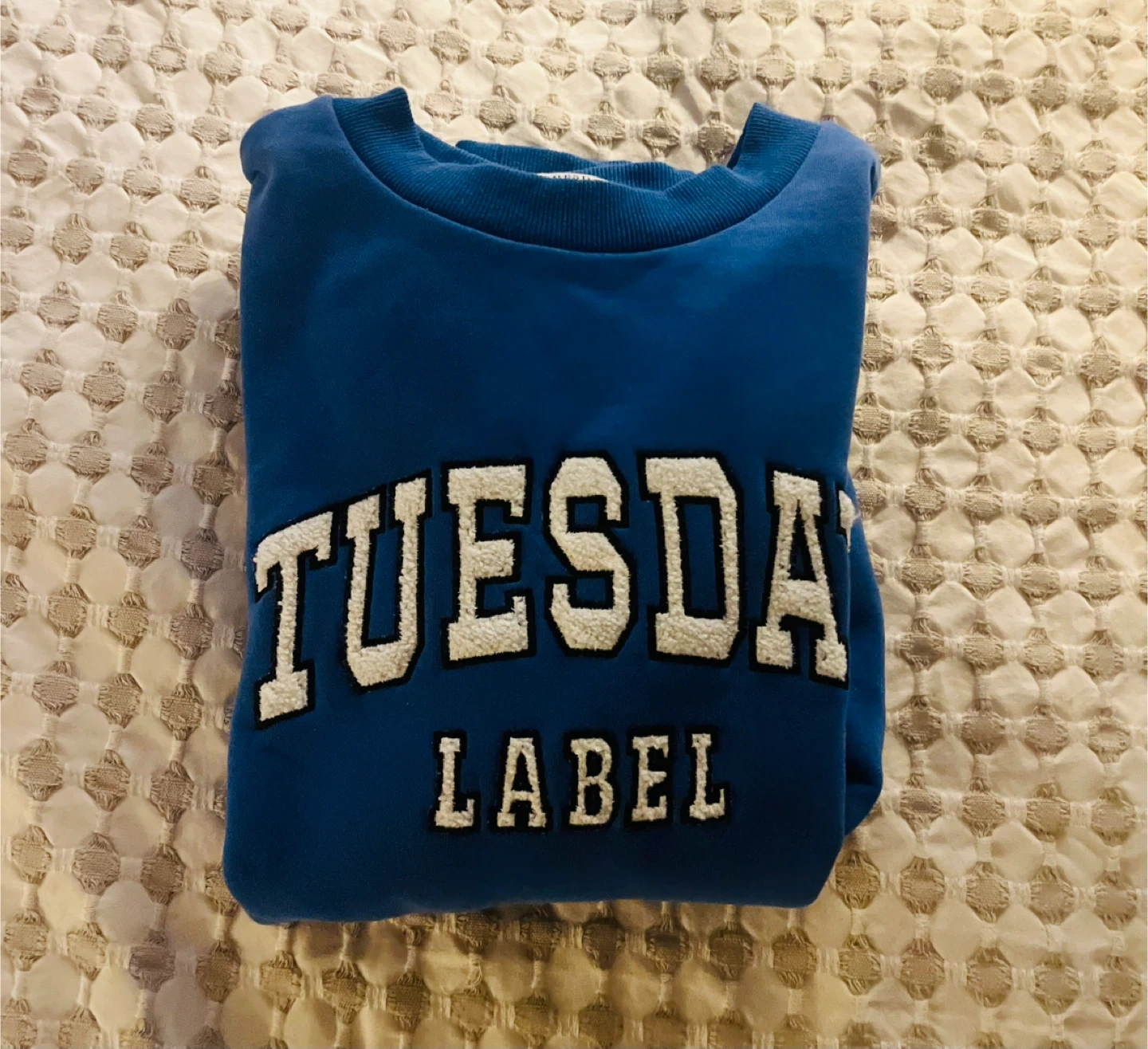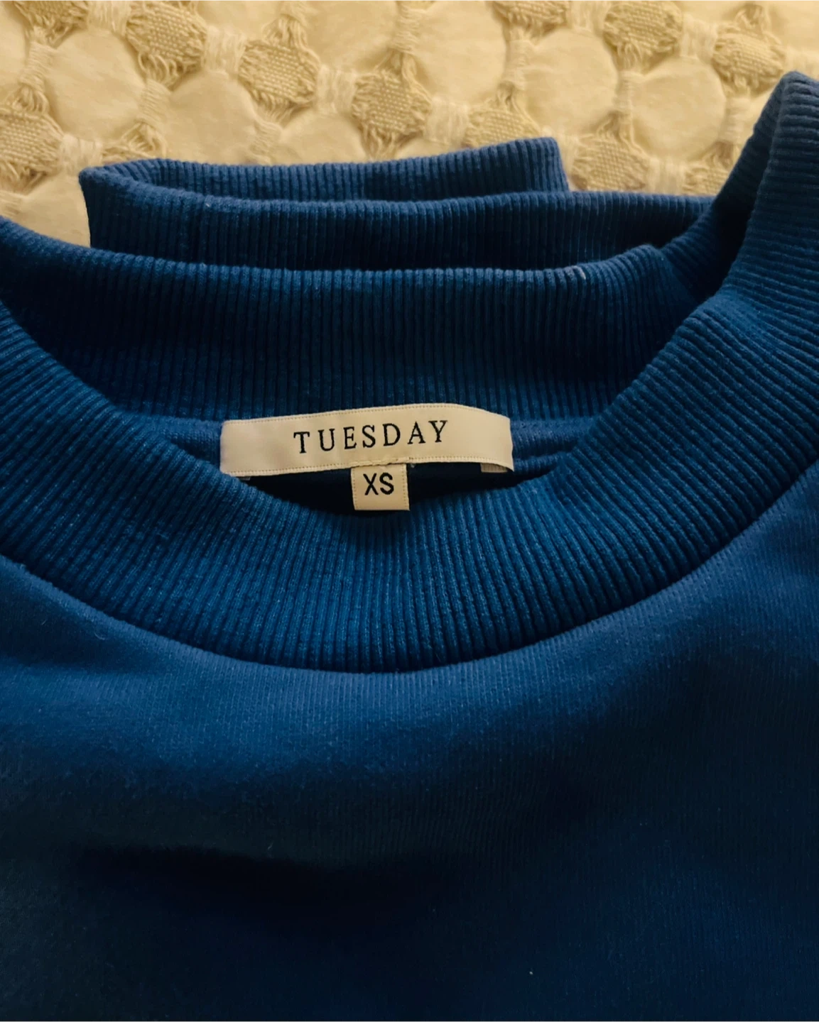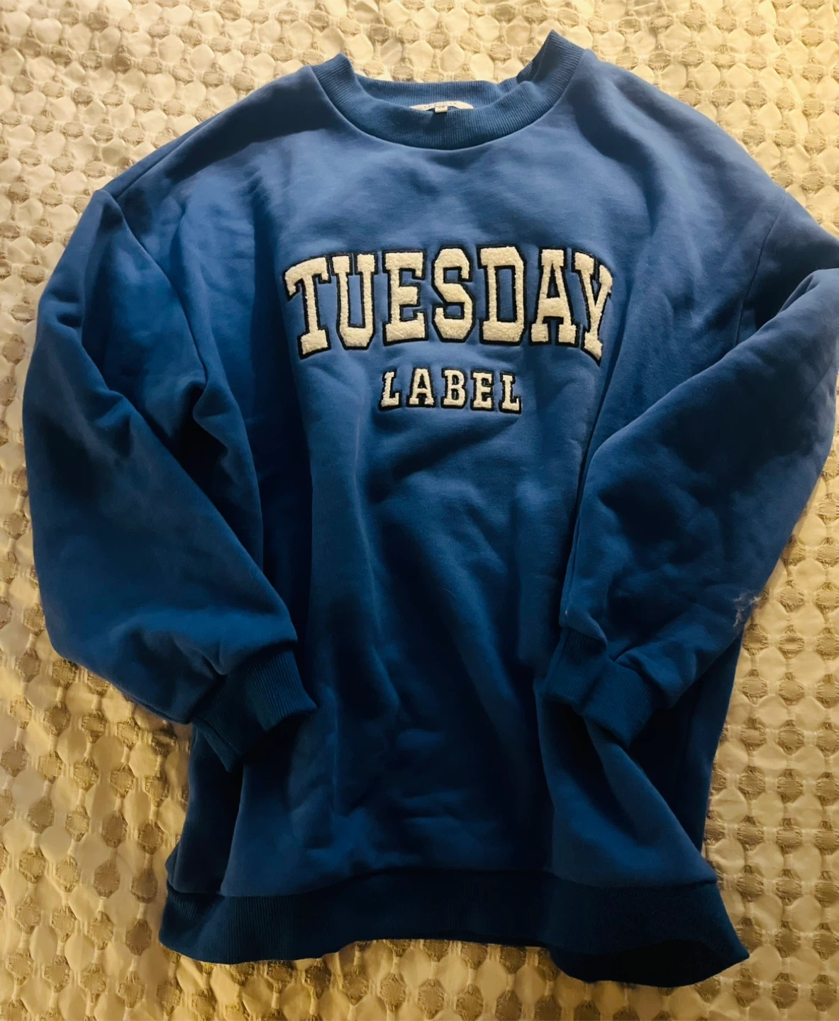 Blue crewneck sweatshirt with 'TUESDAY LABEL' graphic. Luxury New Zealand brand. It's a size XS but fits like Medium. This sweatshirt's design is perfect for casual wear.