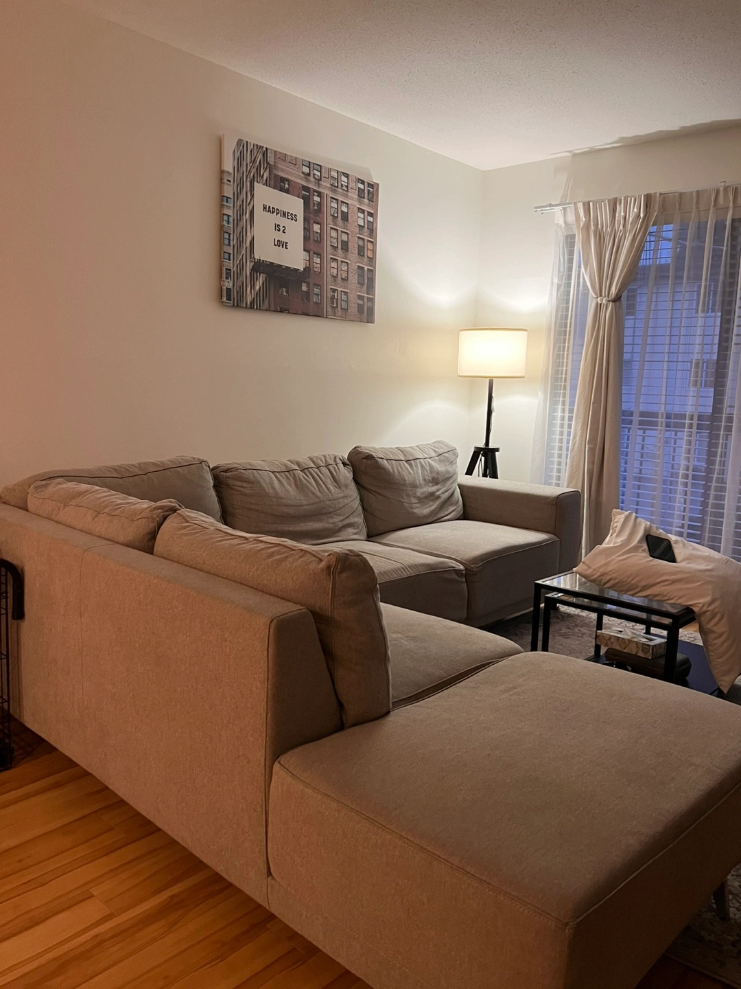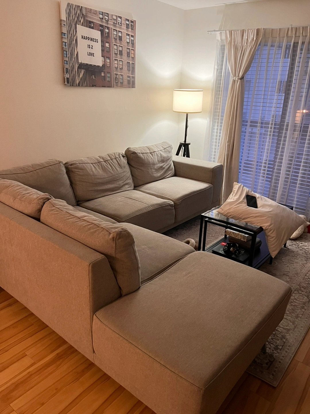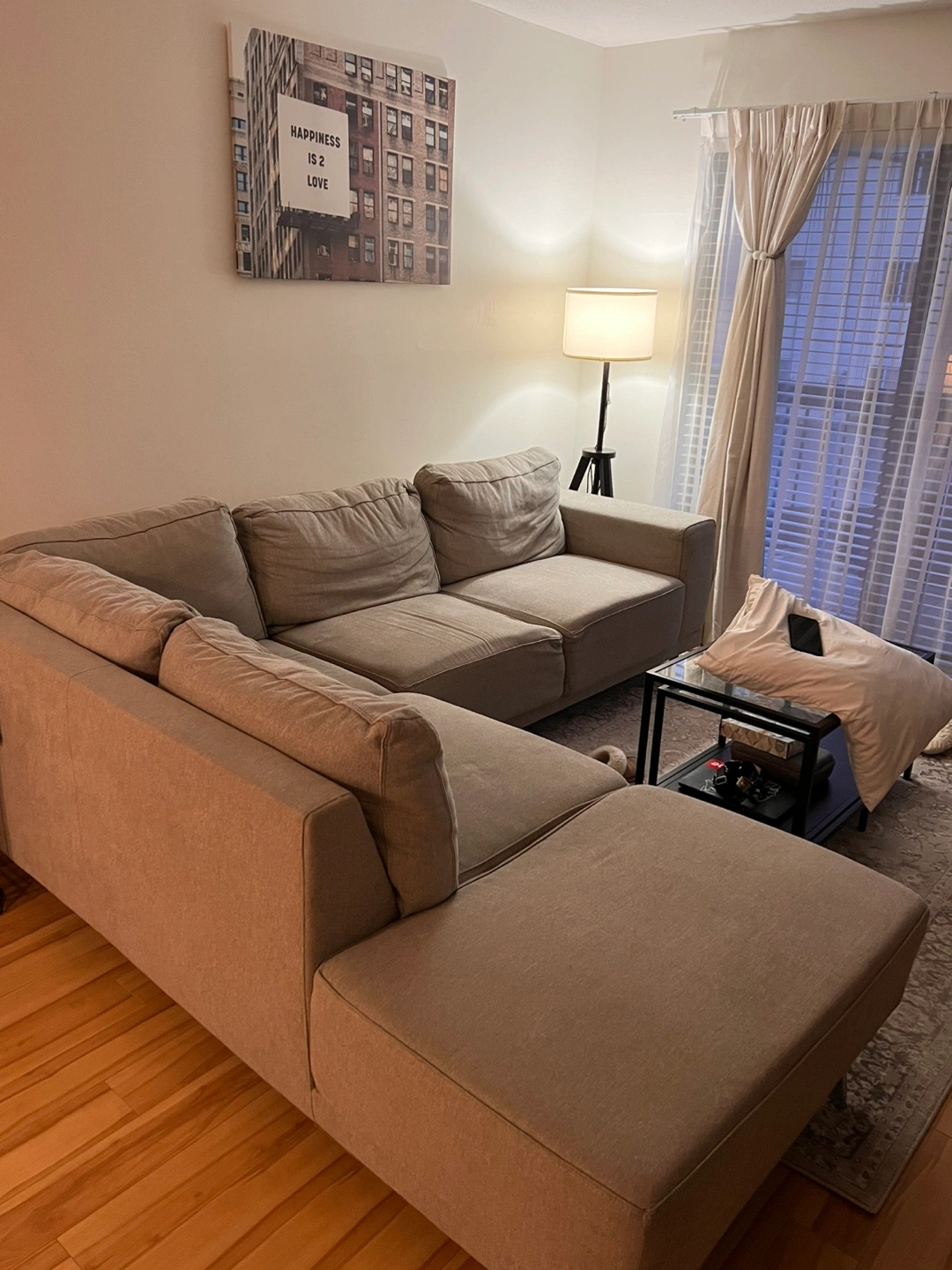 Spacious and comfortable L-shaped sectional sofa. Neutral grey fabric upholstery. Modern design. Includes chaise lounge. Perfect for a living room.