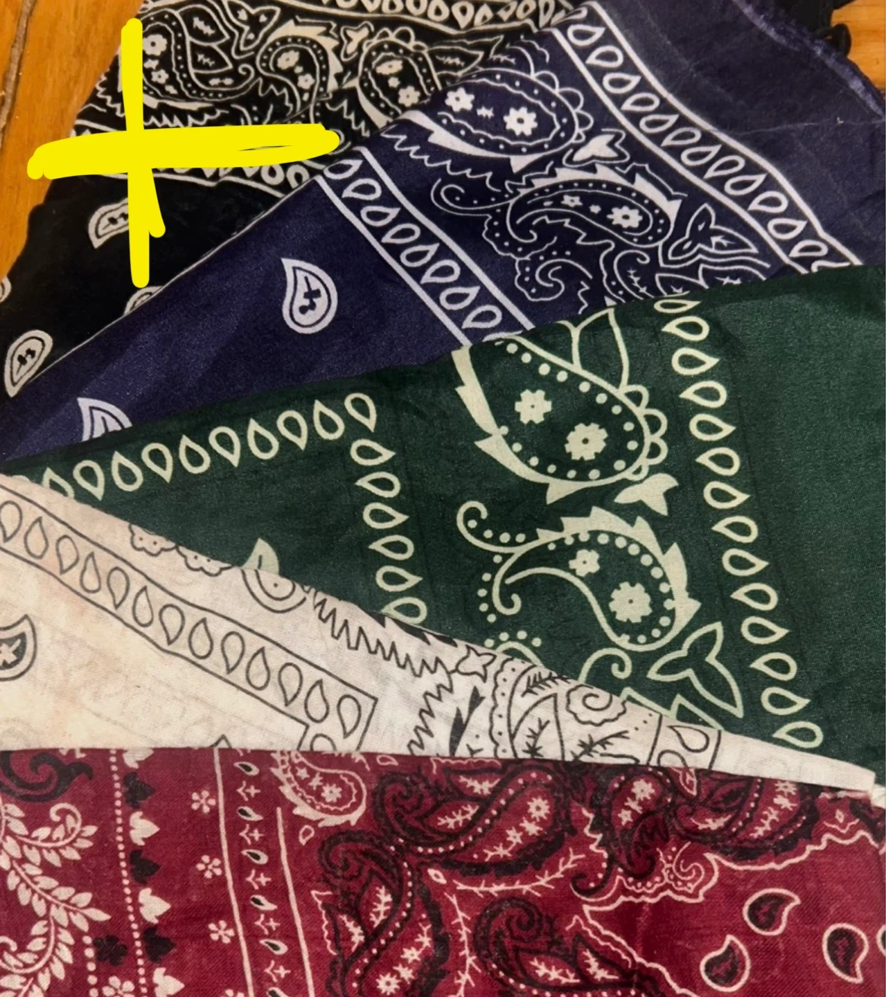 Five bandanas with classic paisley patterns in black, navy, green, cream, and burgundy. Fabric is soft and lightweight. Great for accessorizing or everyday use!