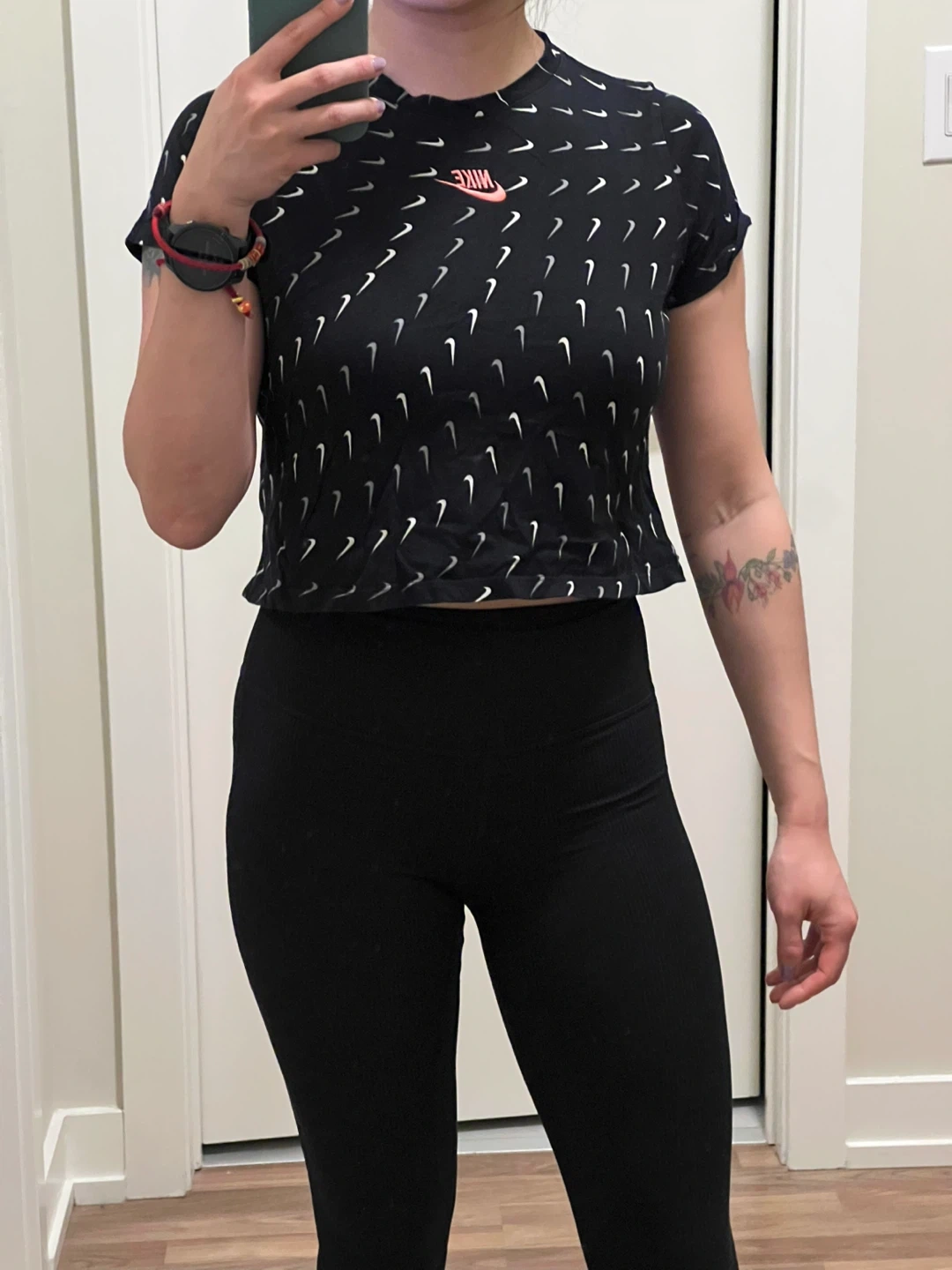 This is a Nike t-shirt in black featuring a repeating white Swoosh logo pattern. It has a classic crew neck and short sleeves. The fabric is soft and comfortable.
