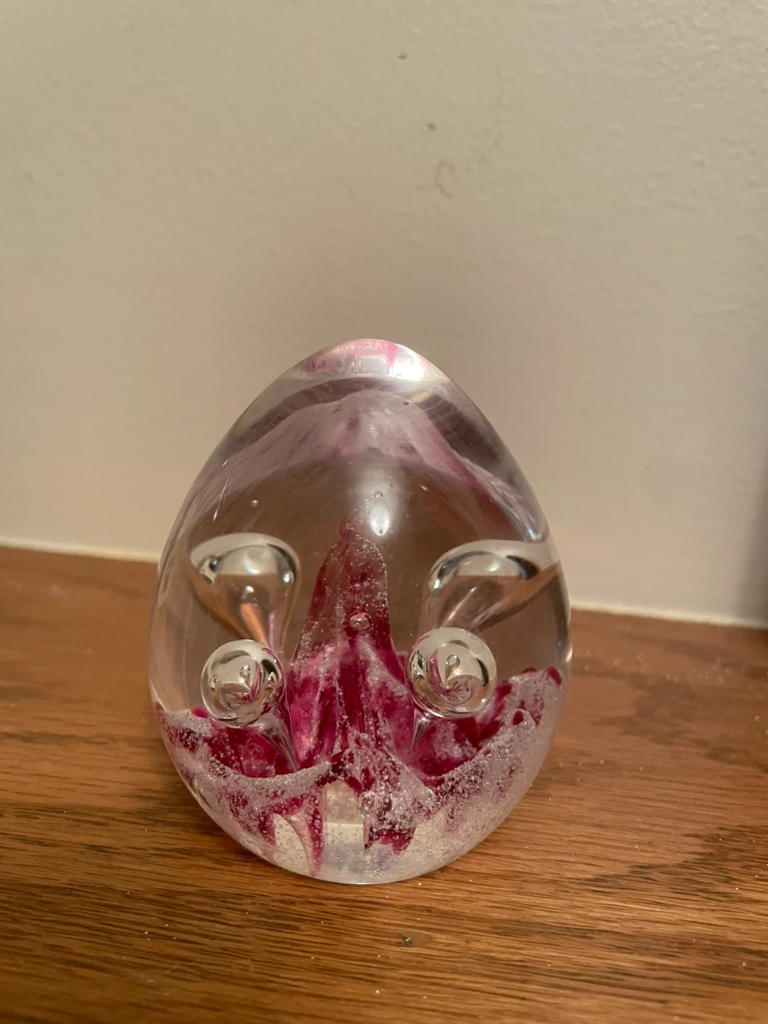 Decorative glass paperweight with embedded pink floral elements and air bubbles. Adds a touch of elegance to any desk or shelf. Perfect for holding down papers or as a standalone display piece!