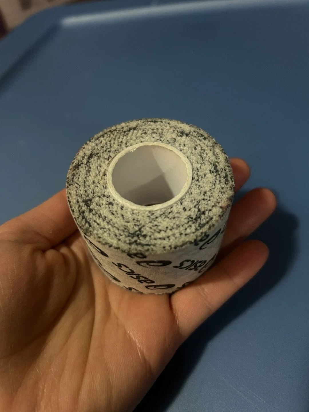 This is a roll of Asics athletic tape. It's white with black Asics logos printed all over it. It's great for sports support and recovery. Useful for athletes needing joint stability.