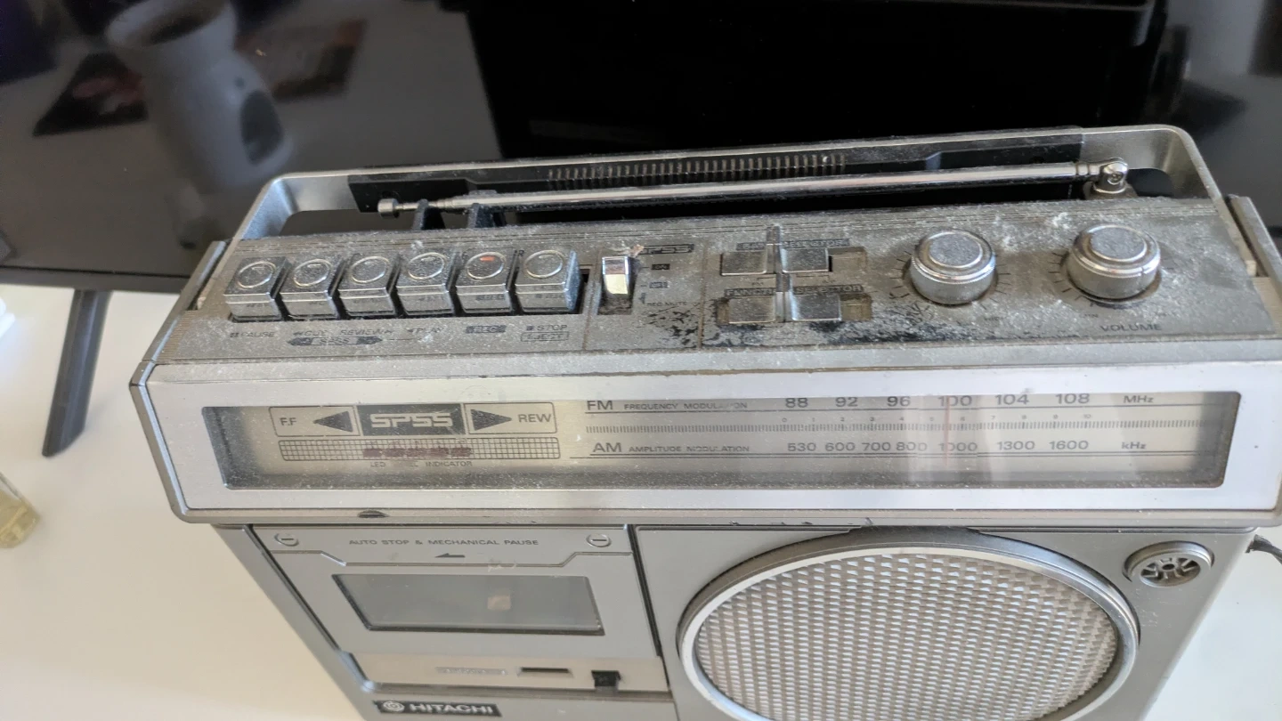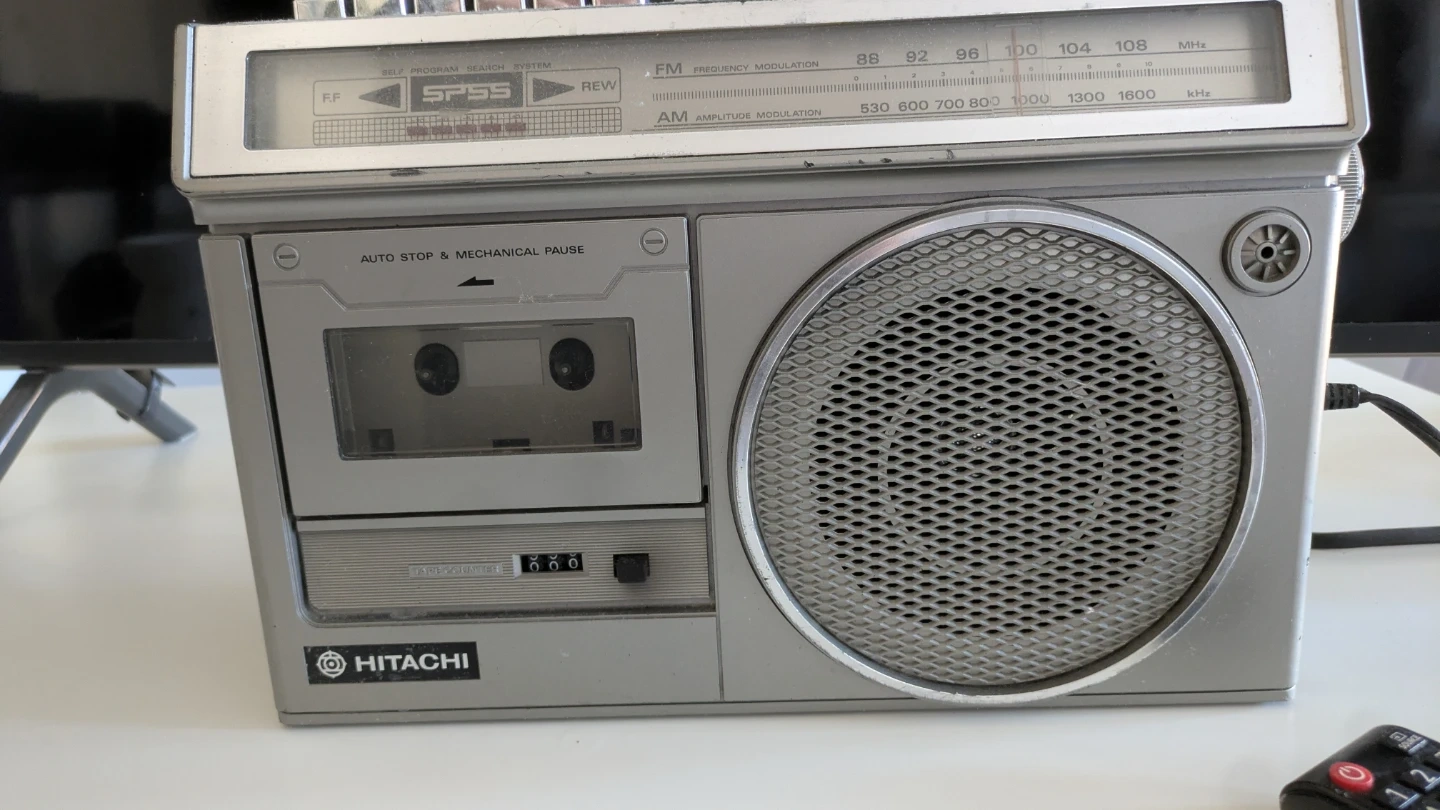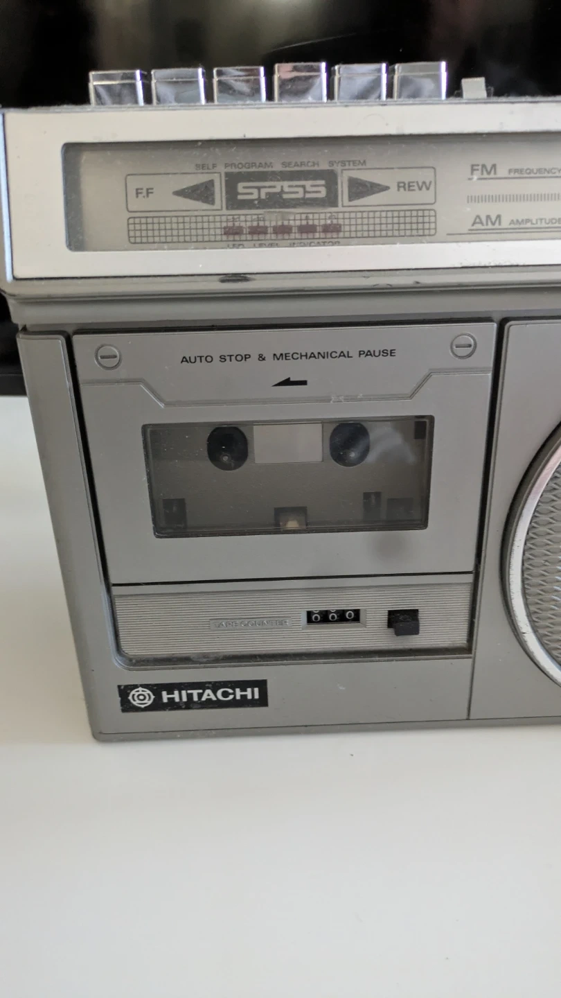 This is a vintage Hitachi boombox with a cassette player and AM/FM radio. It has auto stop and mechanical pause functions. The unit has seen some wear but appears functional.
