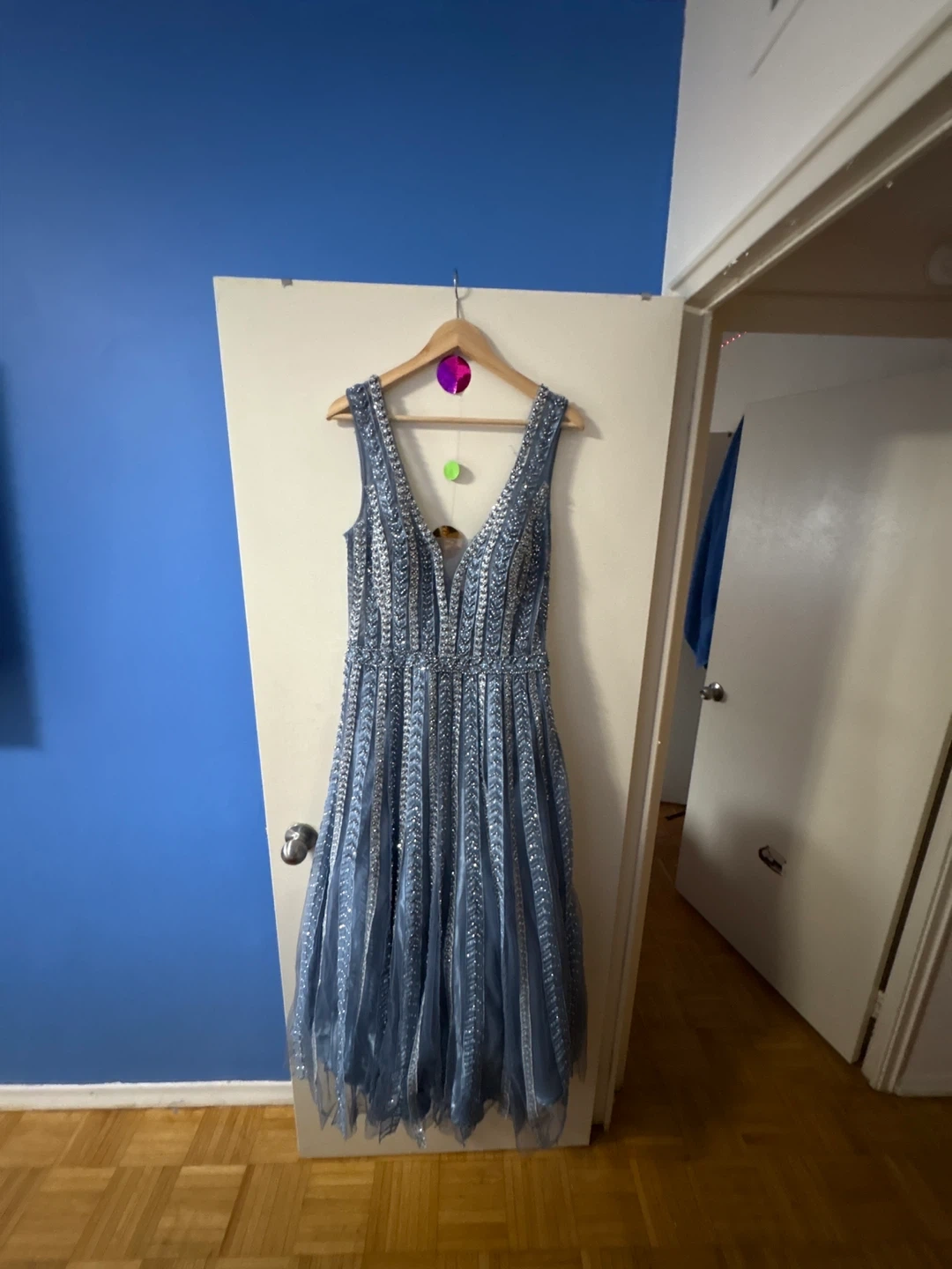 Selling a beautiful blue dress with intricate embellishments! It features a flattering V-neck design and a flowing skirt. Perfect for a special occasion or a night out