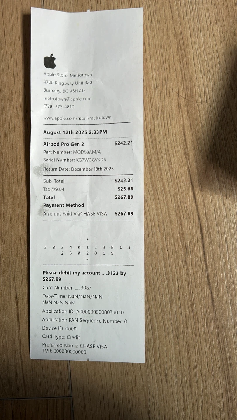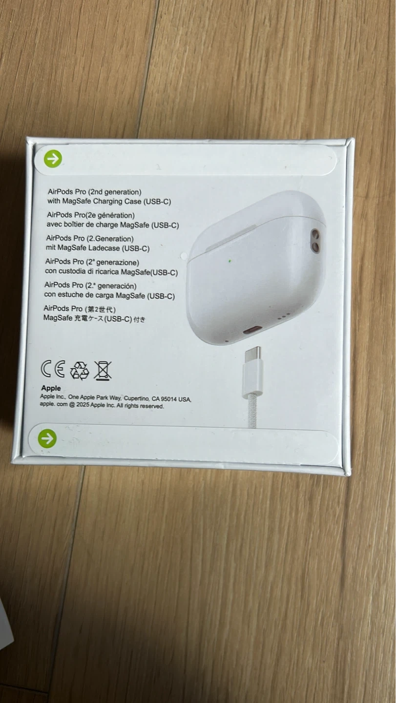 Apple AirPods Pro (2nd generation) with MagSafe Charging Case. Includes USB-C charging cable. Purchased August 12th, 2025.