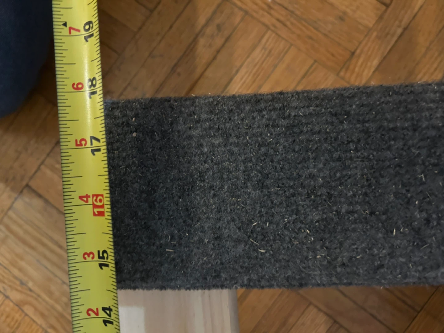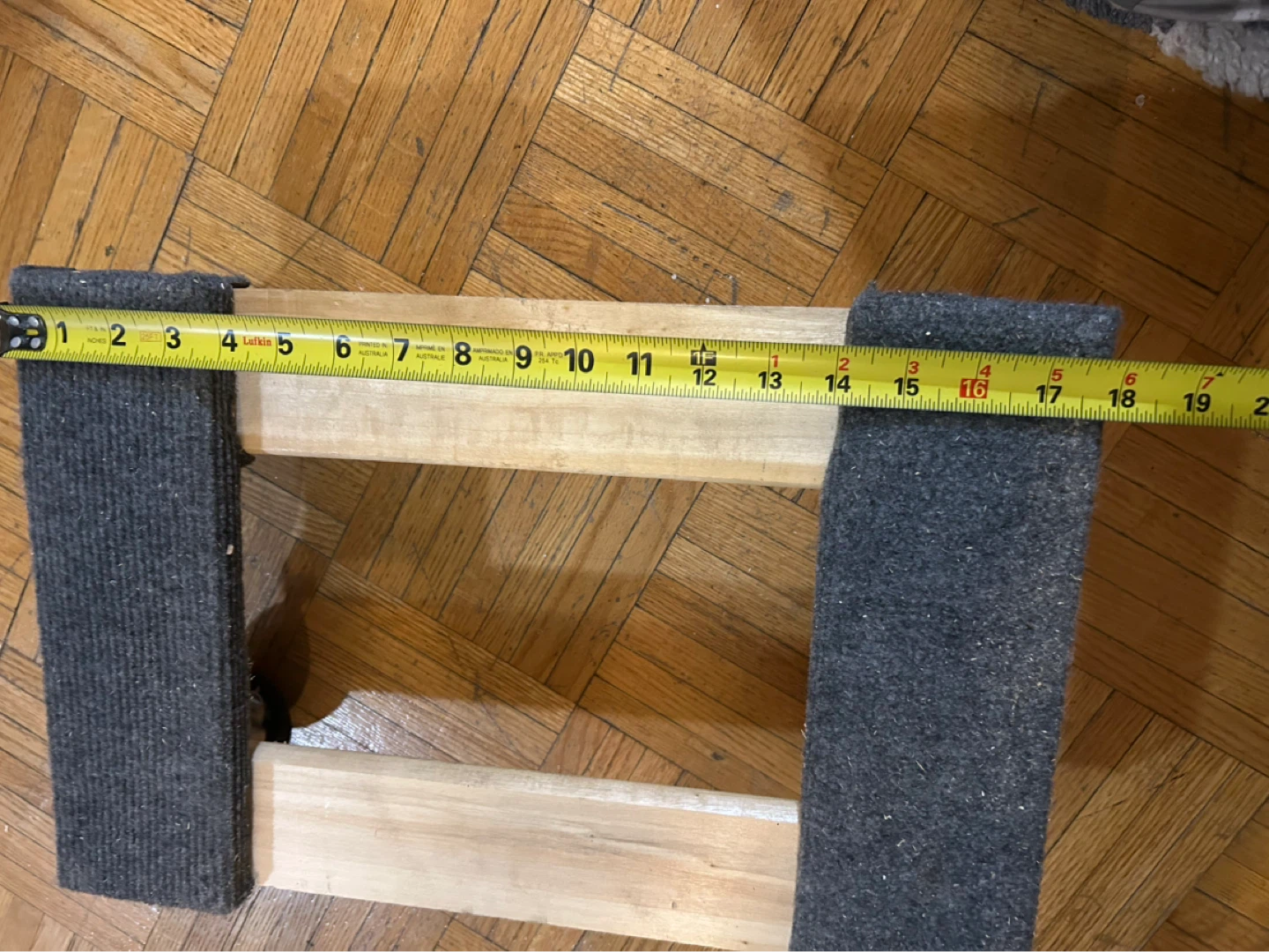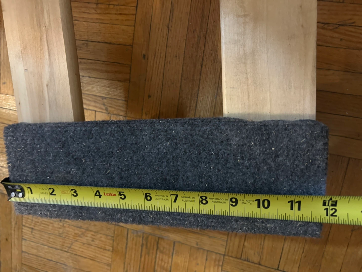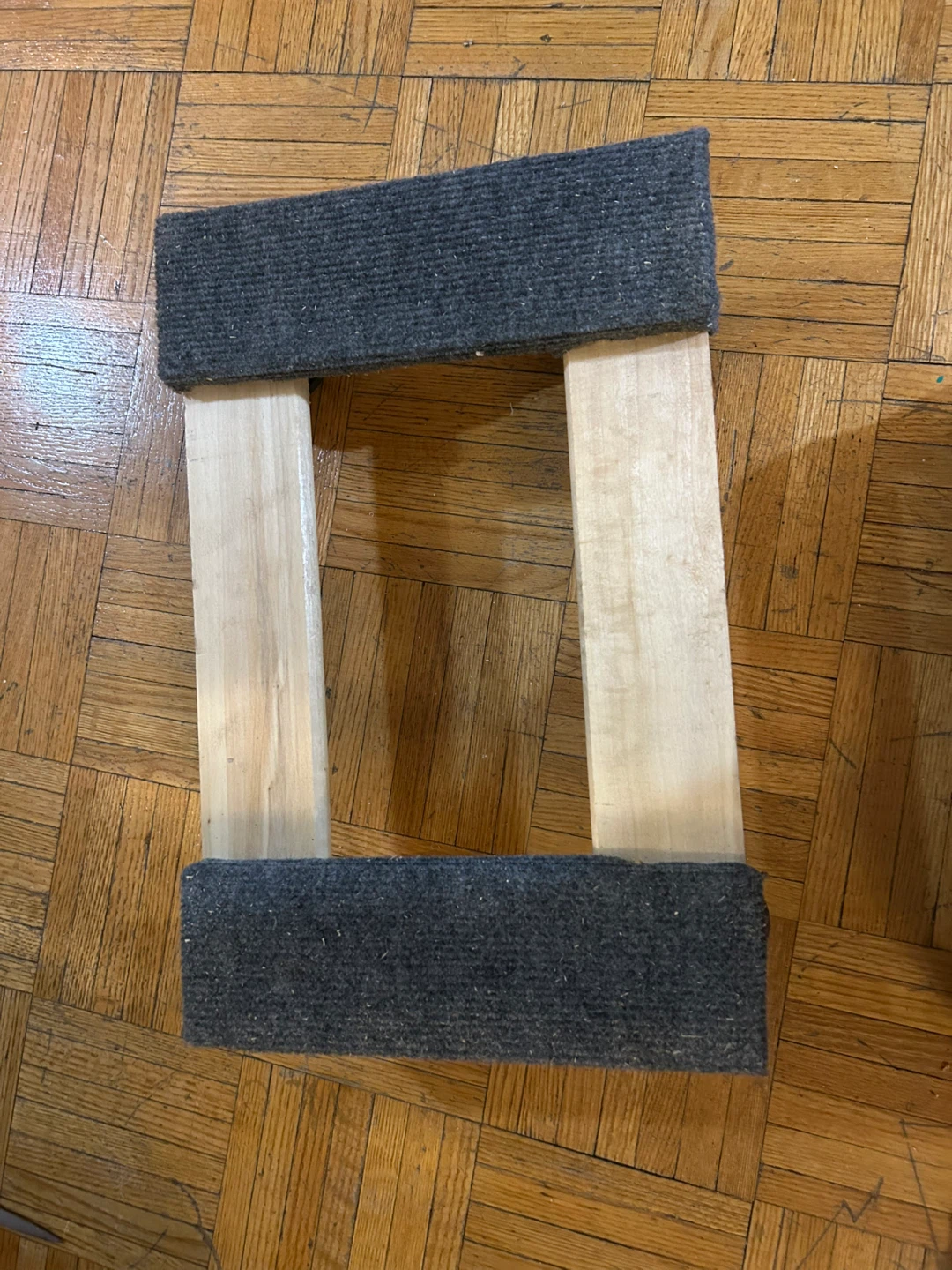 Set of wooden furniture sliders with grey felt bottoms. Each slider measures approximately 10 inches long by 3 inches wide. These are great for moving heavy furniture easily across carpeted floors. They're made of wood and felt.