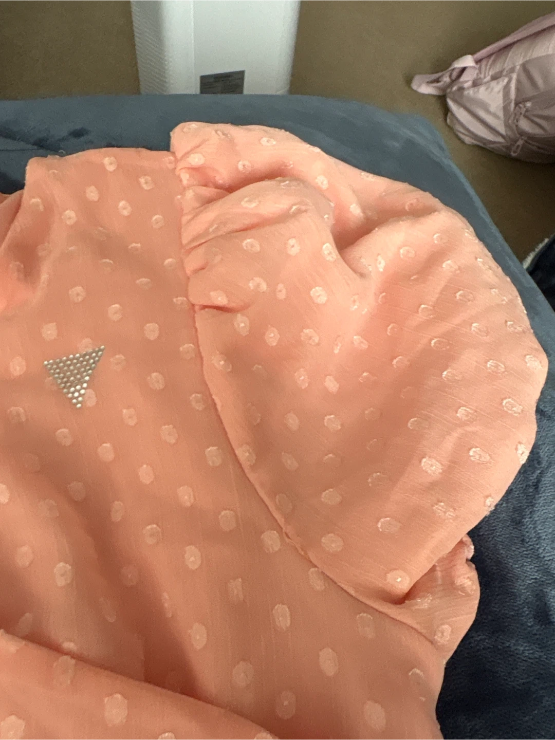 This peachy pink dress from Guess features a polka dot pattern and a ruffled overlay. It has short, puff sleeves and a flattering wrap-style skirt. This dress is great for a spring or summer occasion!
