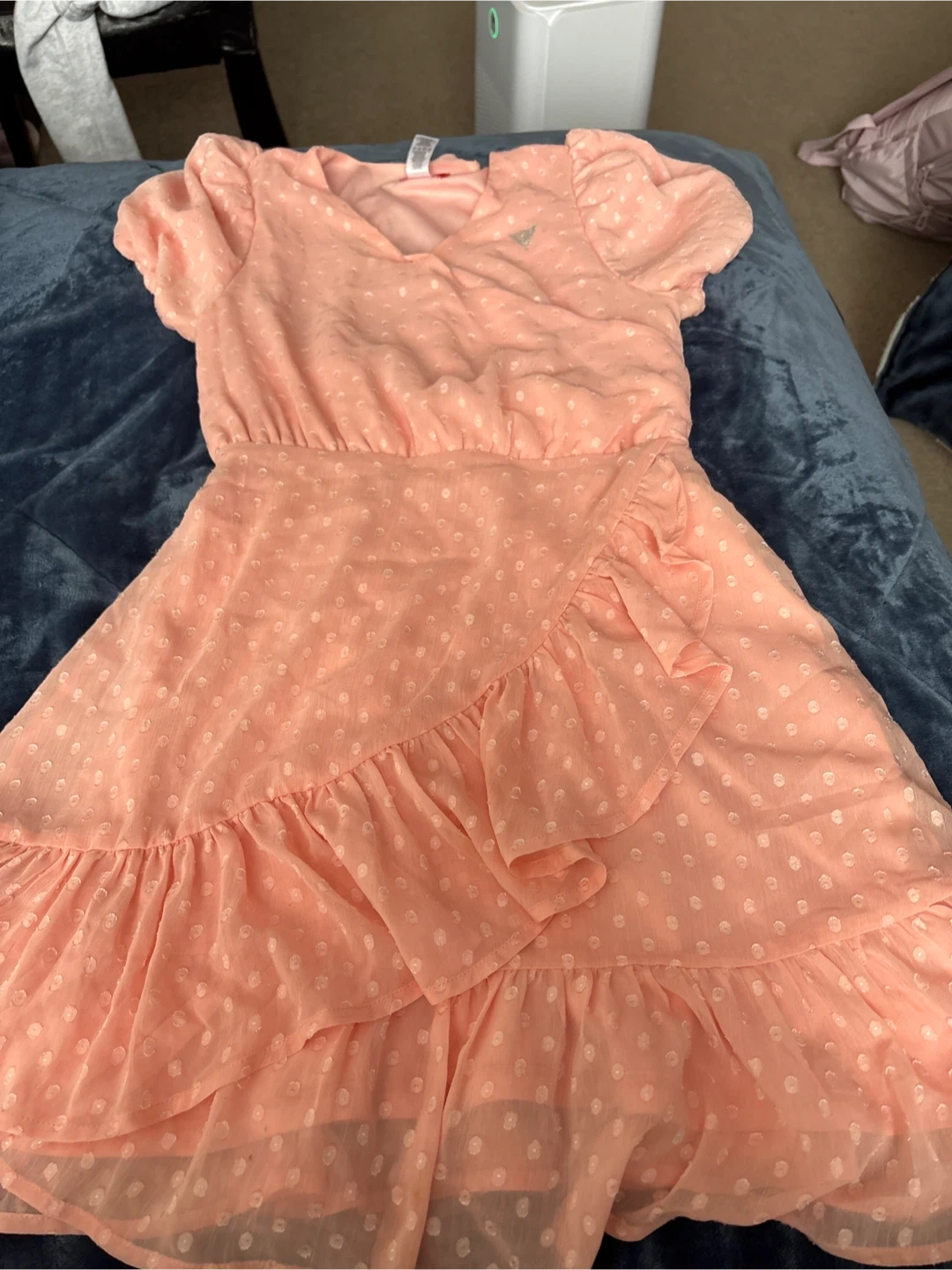 This peachy pink dress from Guess features a polka dot pattern and a ruffled overlay. It has short, puff sleeves and a flattering wrap-style skirt. This dress is great for a spring or summer occasion!