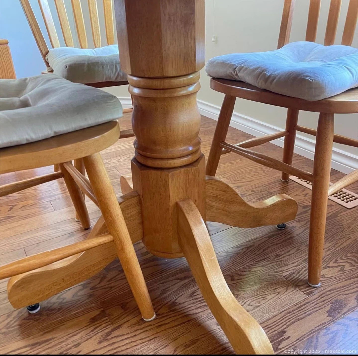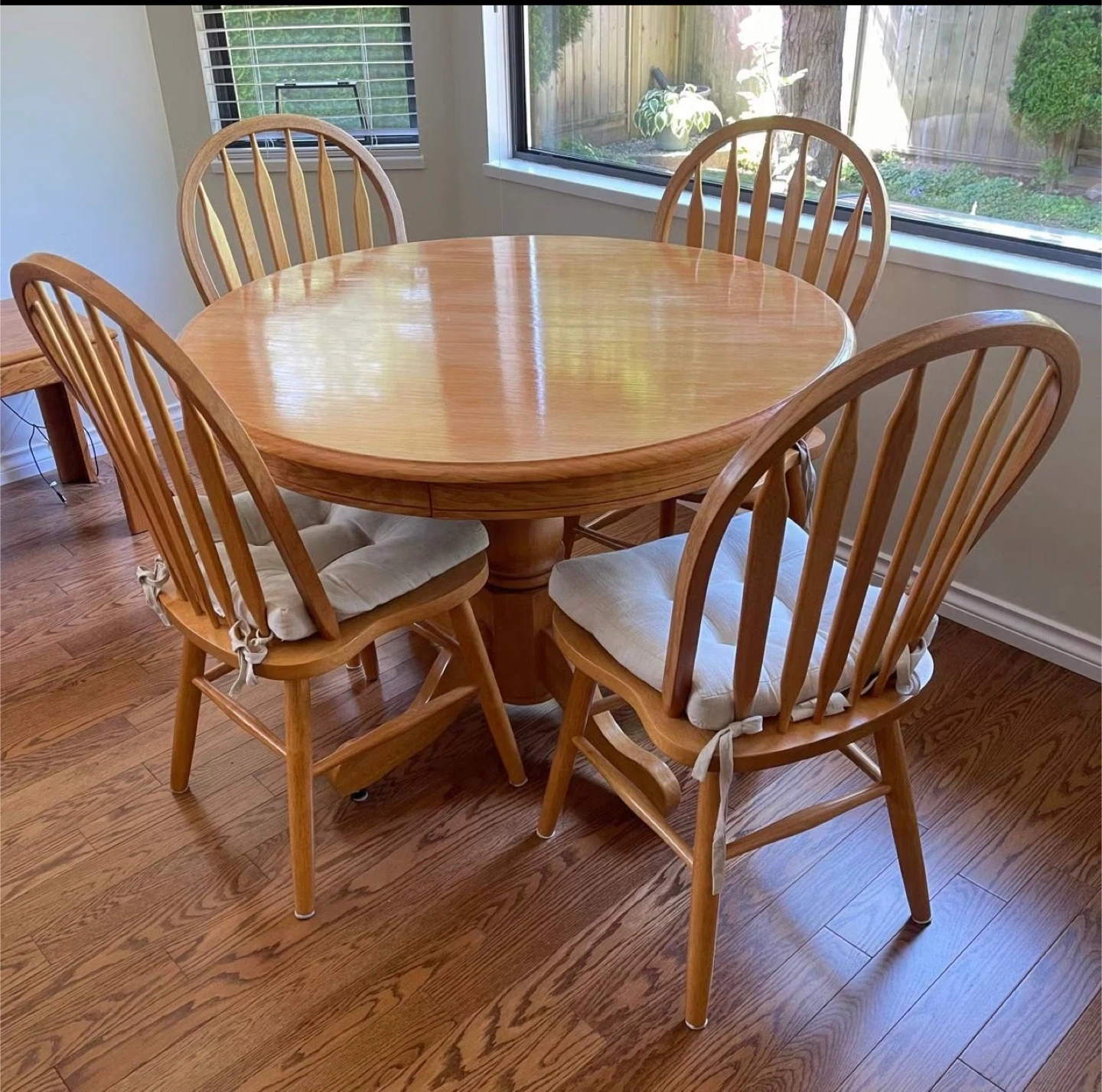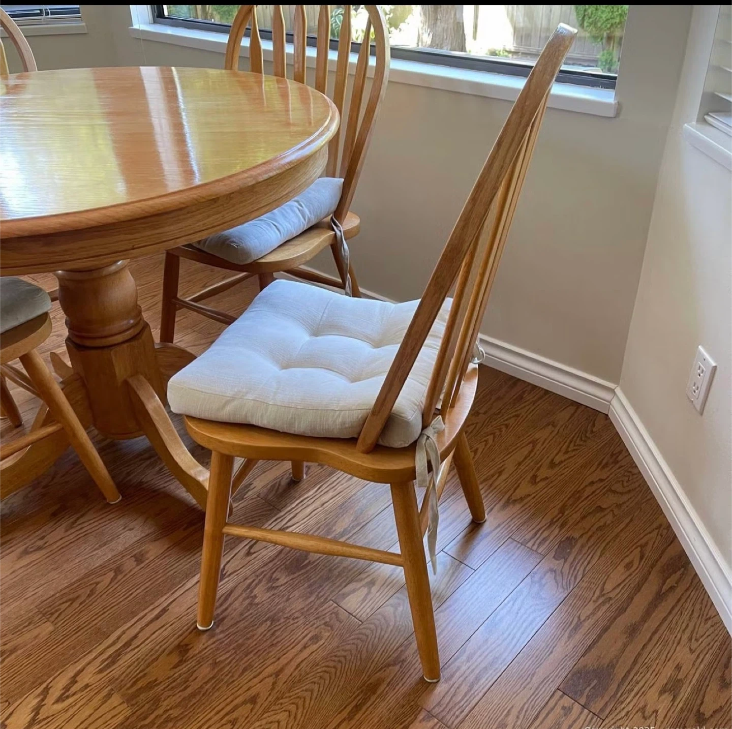 Selling a lovely round wooden dining table that comes with four matching chairs. The set has a classic design and would look great in any dining room or kitchen. Each chair has a comfy seat cushion. The table has a sturdy pedestal base. Perfect for family dinners or gatherings with friends