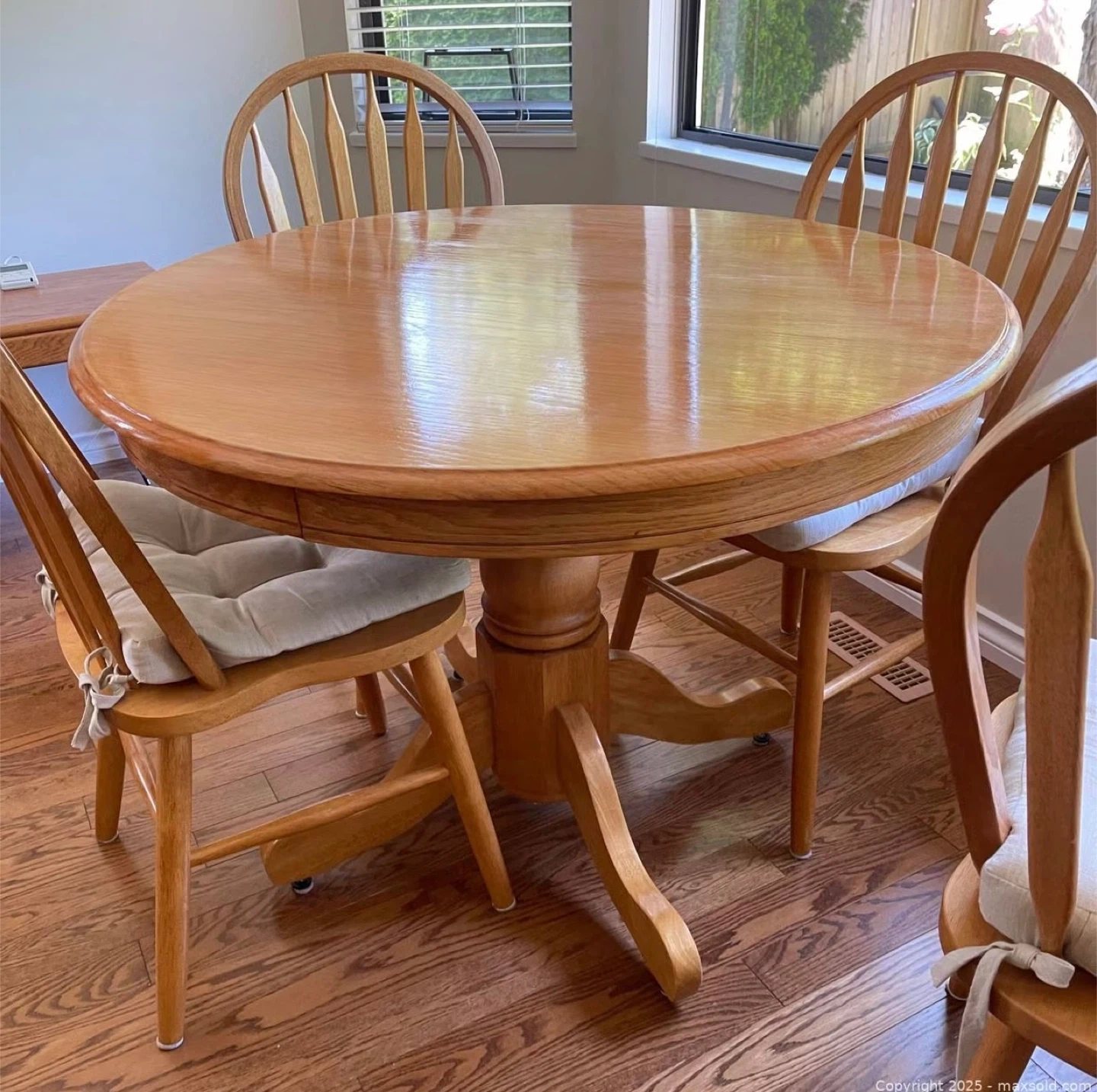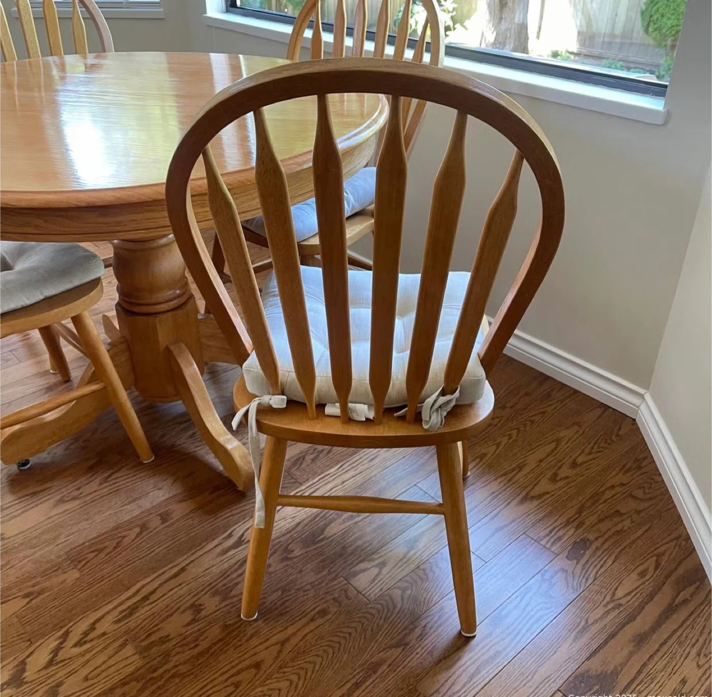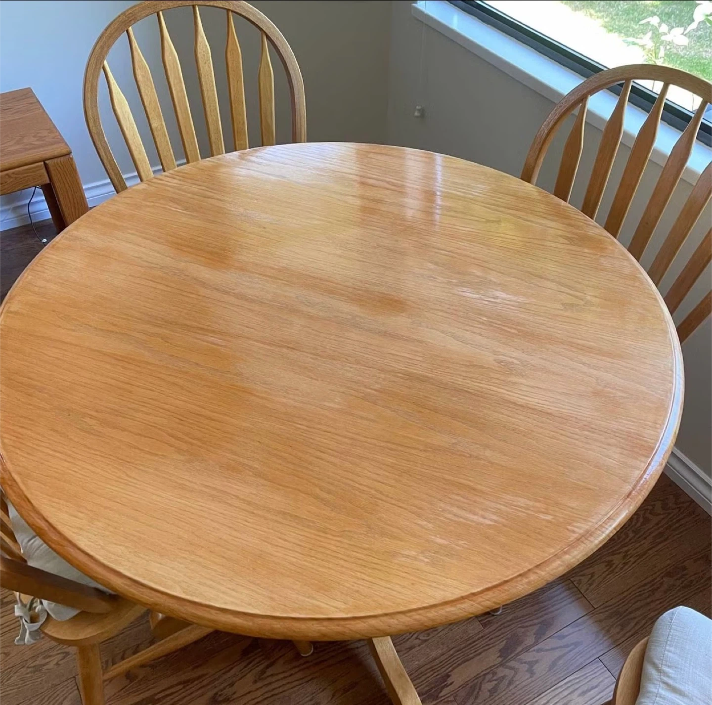 Selling a lovely round wooden dining table that comes with four matching chairs. The set has a classic design and would look great in any dining room or kitchen. Each chair has a comfy seat cushion. The table has a sturdy pedestal base. Perfect for family dinners or gatherings with friends