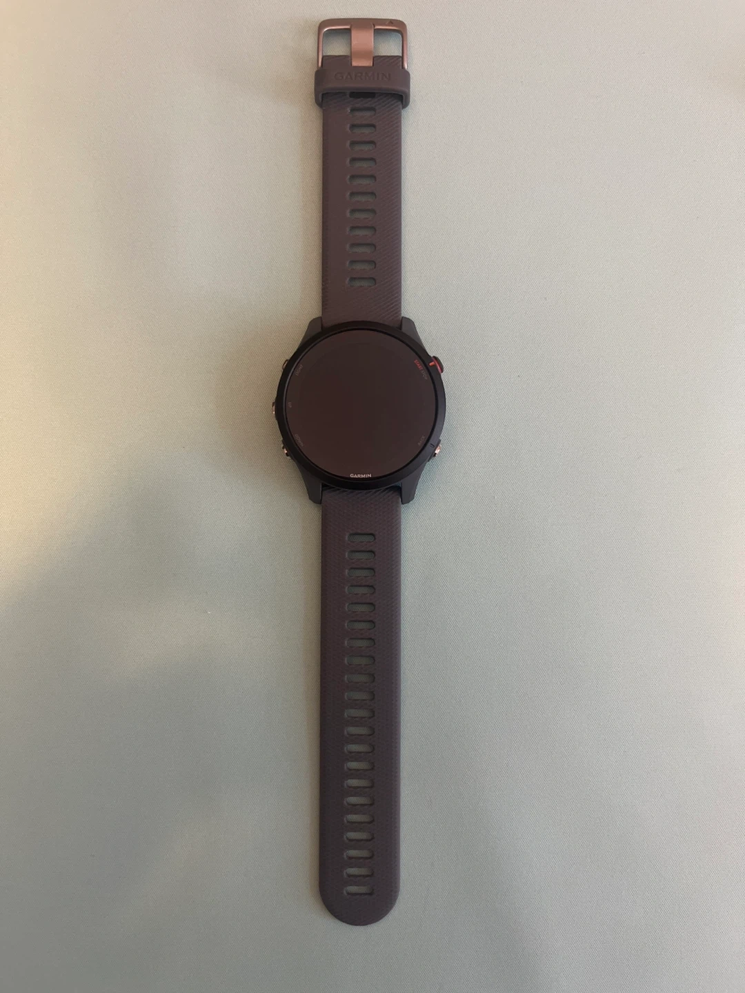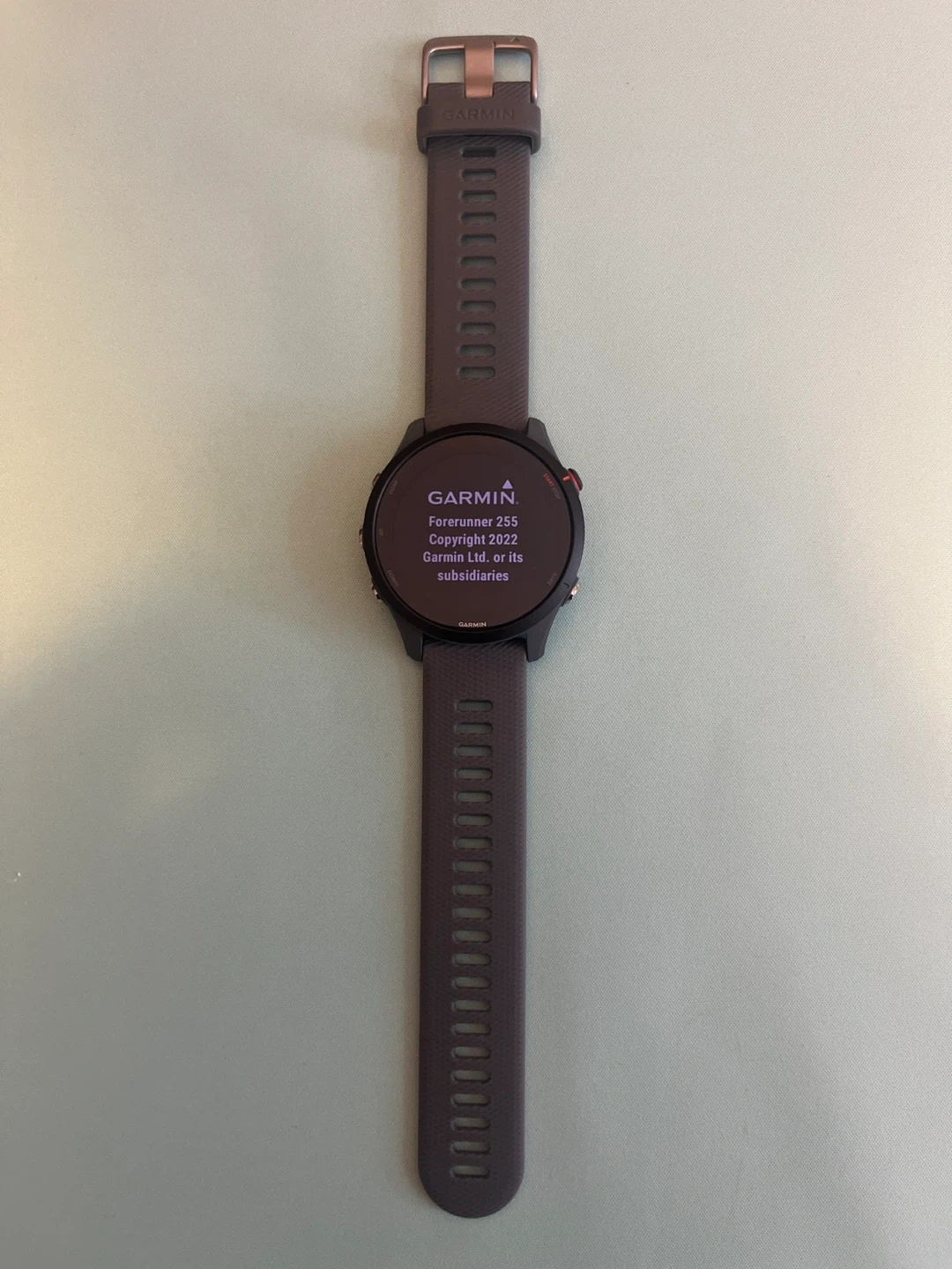 Brand New: Garmin Forerunner 255 smartwatch with a dark grey band and rose gold buckle. This watch is loaded with features for runners and athletes. It's lightweight and comfortable for everyday wear and intense training. It has advanced training metrics and GPS capabilities.