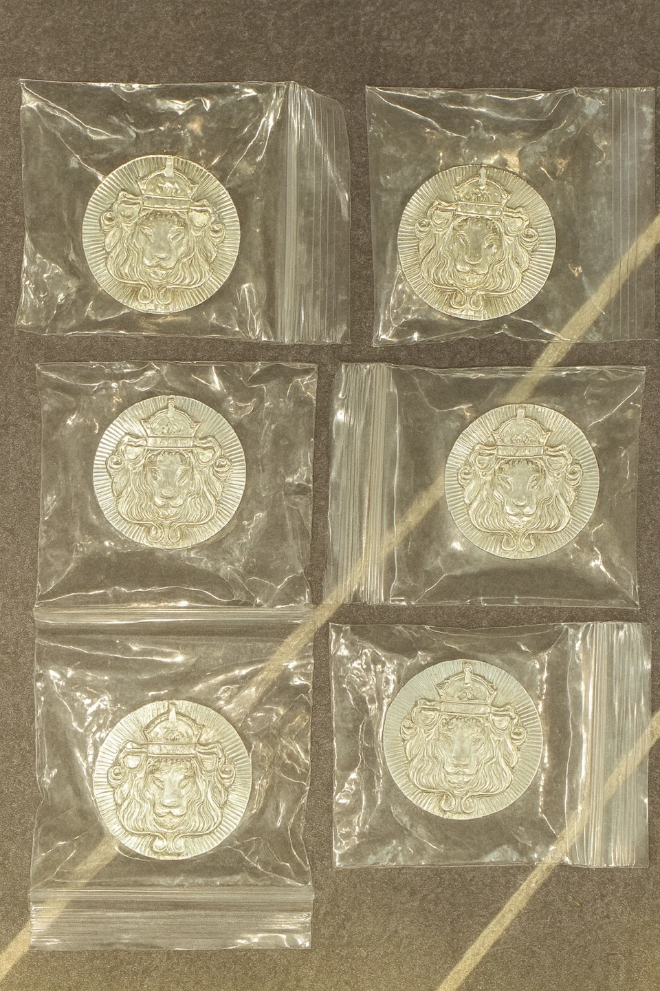 5/5 Scottsdale rounds stackable 5oz silver .9999, each featuring a detailed embossed lion wearing a crown. They come individually in clear plastic bags. These medallions have a classic, regal design.