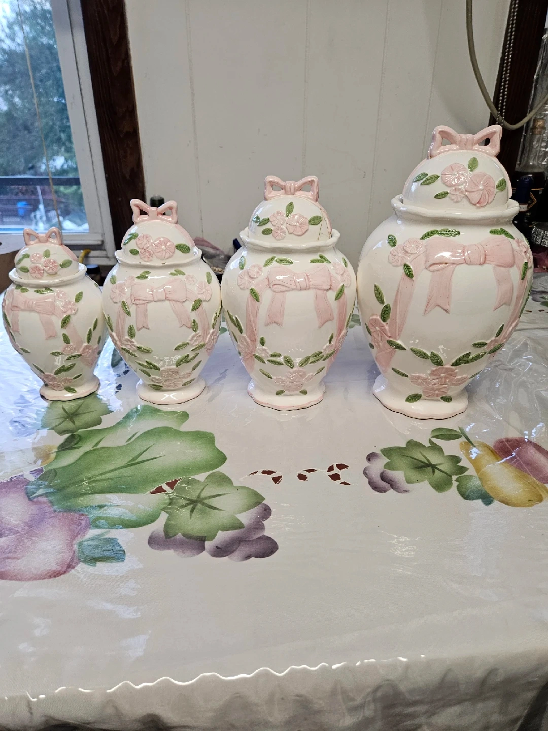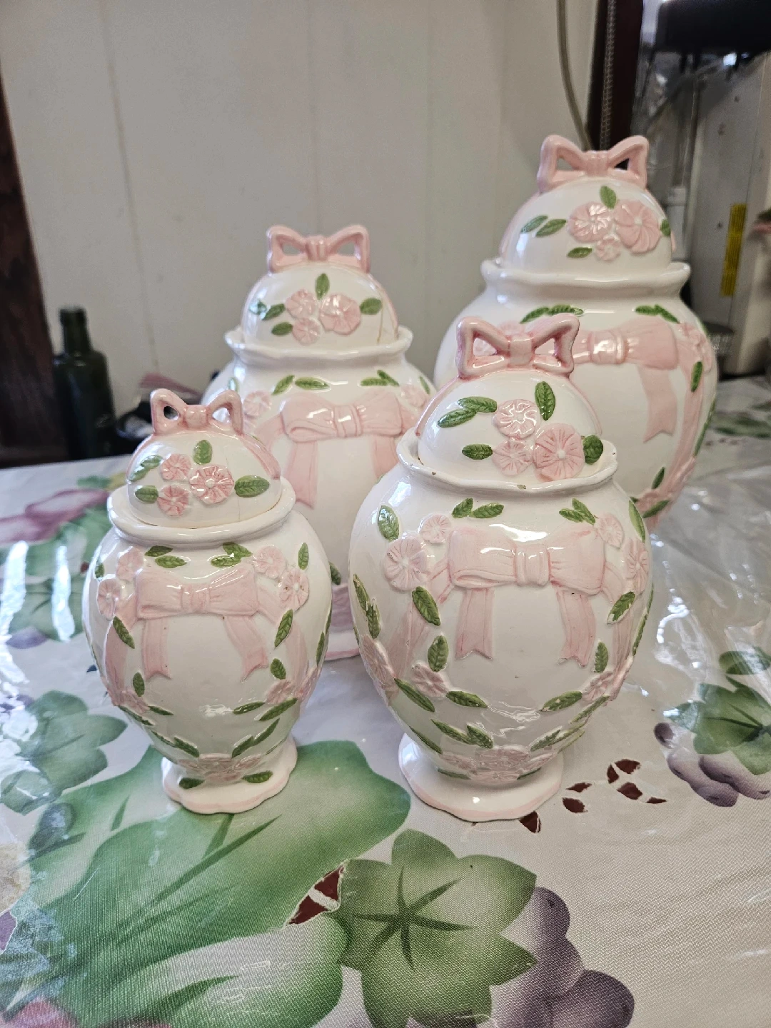 Selling a set of 4 ceramic vases, each with a lid. They have a cute design with pink bows and flowers. Please note that 2 lids have cracks/chips, as shown in the pictures.