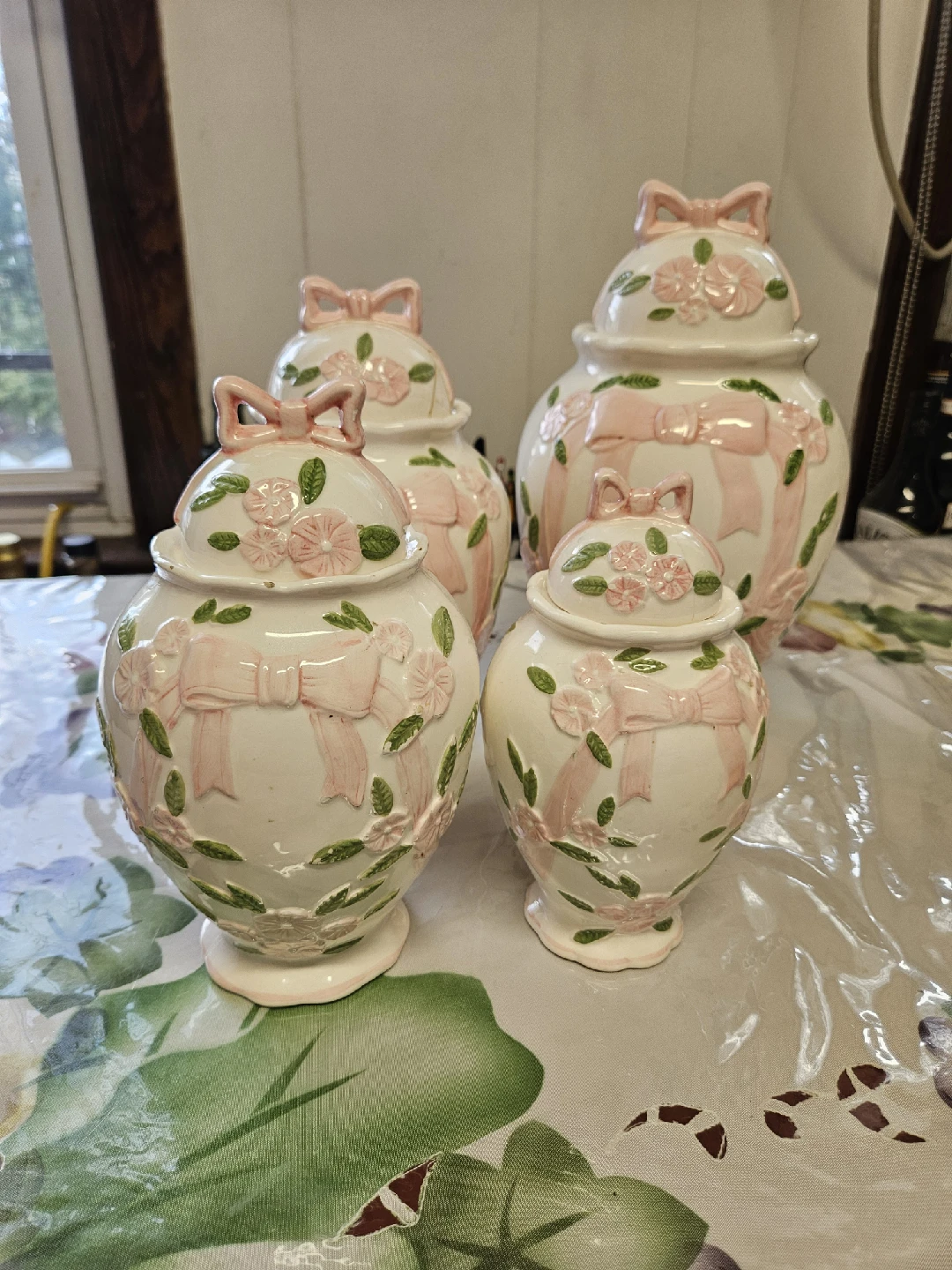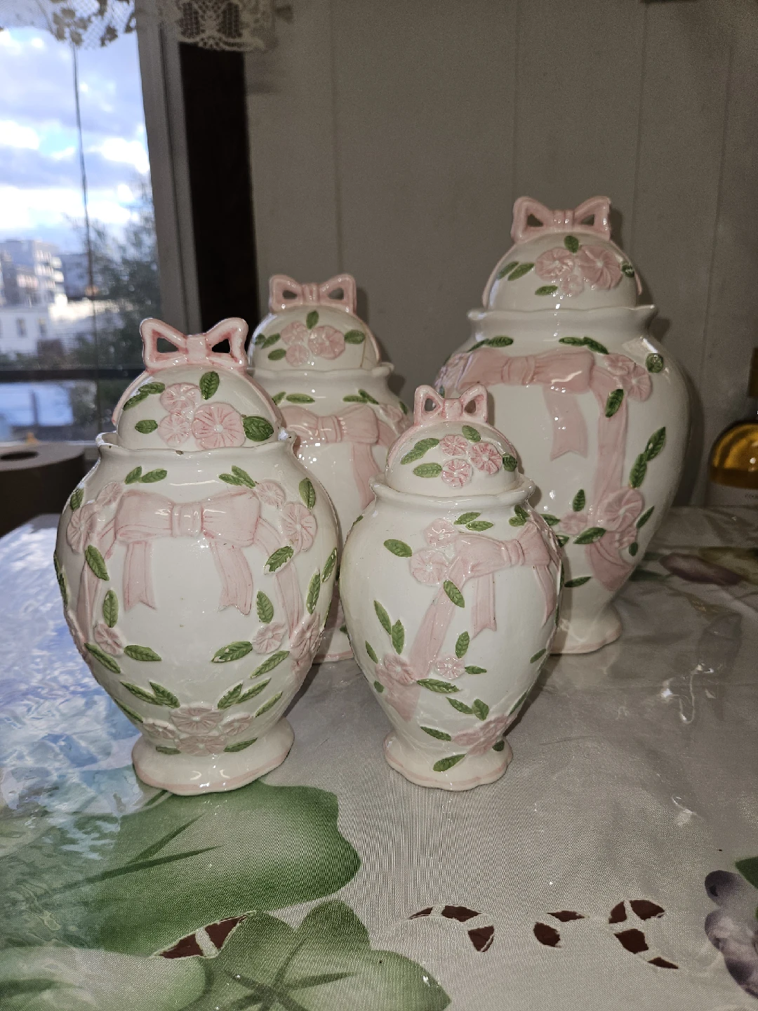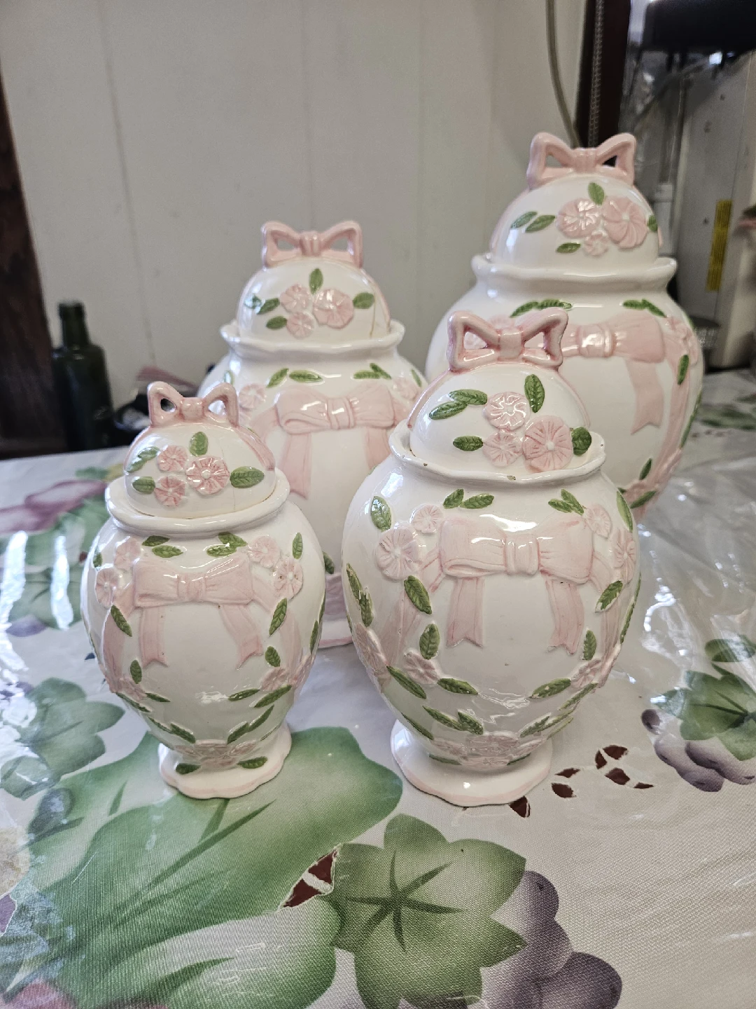 Selling a set of 4 ceramic vases, each with a lid. They have a cute design with pink bows and flowers. Please note that 2 lids have cracks/chips, as shown in the pictures.