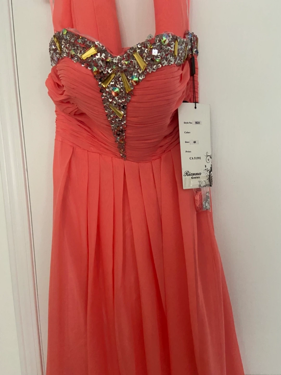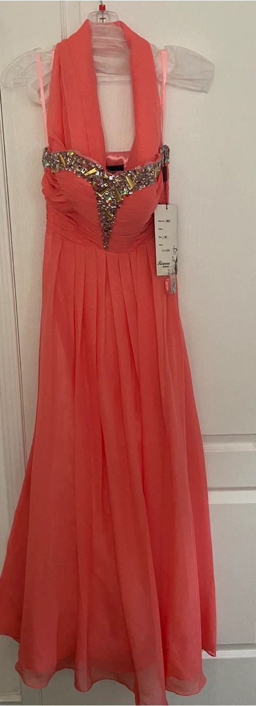 Selling a beautiful brand new coral dress from Rianna Creations. It's a size 4 and features lovely detailing around the neckline. Perfect for a special occasion!