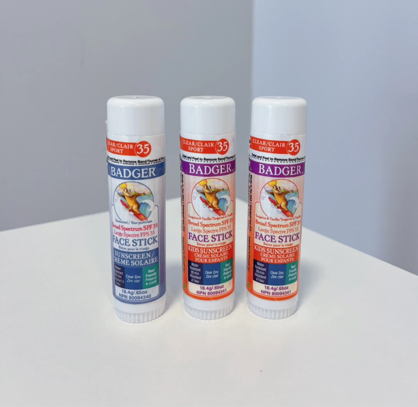 Two are Tangerine & Vanilla scent, one is Unscented. Each stick contains 18.4g/.65oz of sunscreen with clear zinc. It's water-resistant for up to 80 minutes.