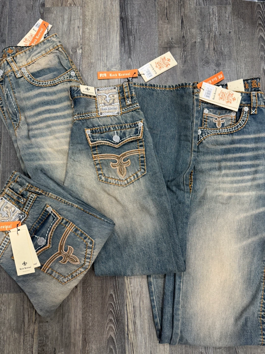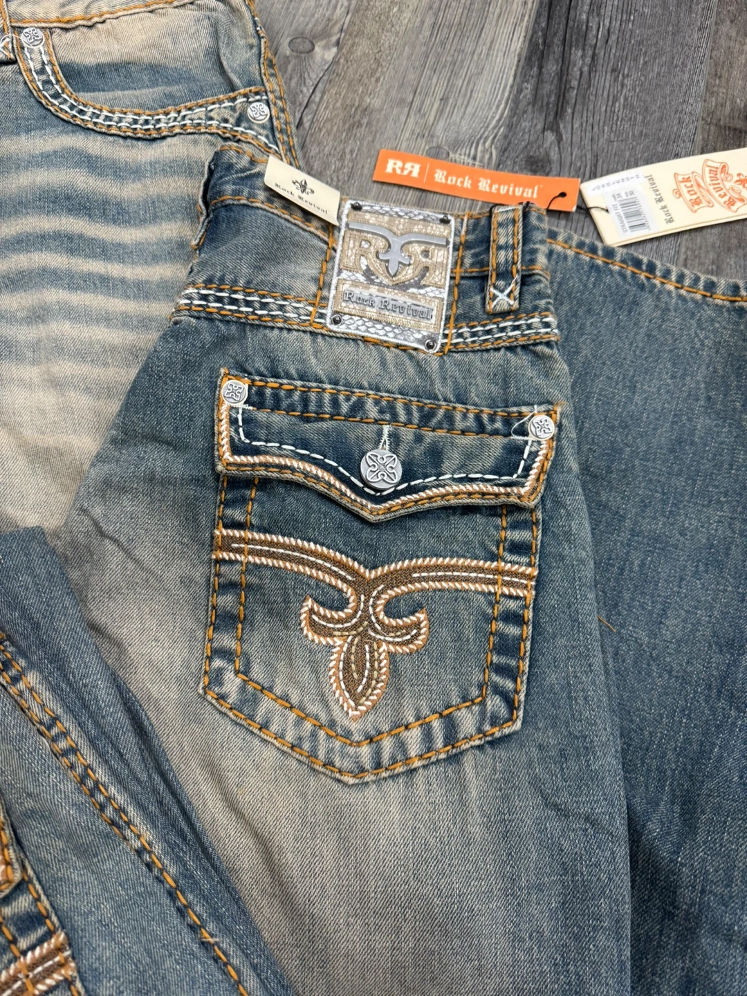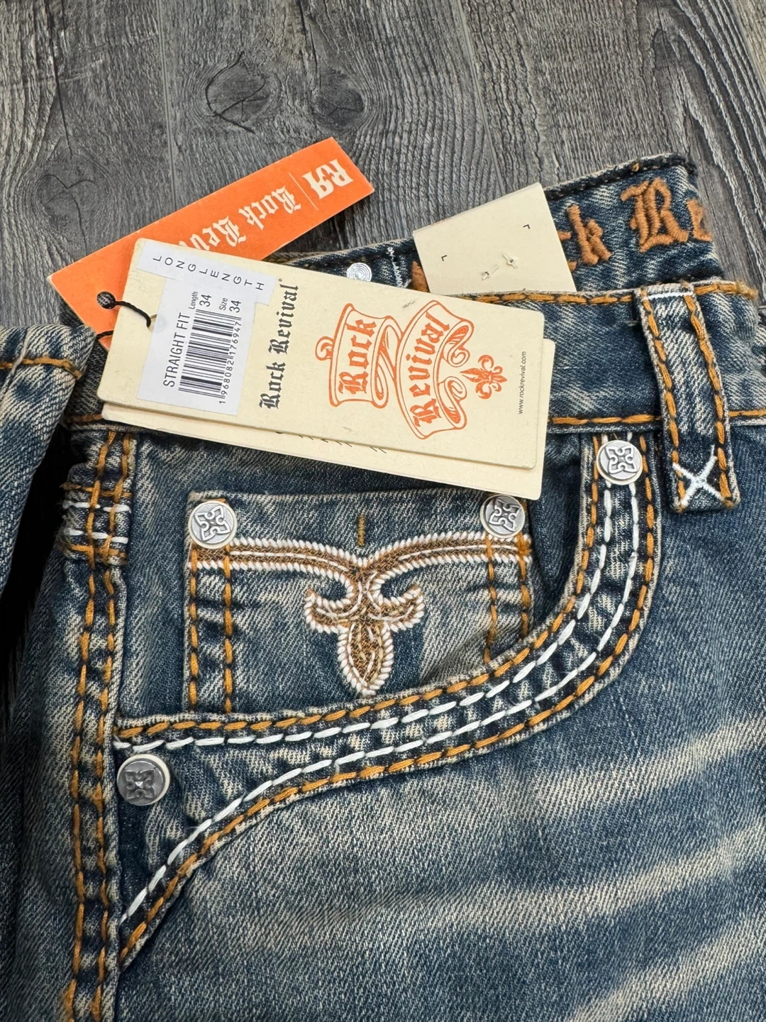 Rock Revival Straight Fit denim jeans with decorative stitching. Size30 to 36waist, 30 to 36inseam. These jeans feature a classic blue wash with subtle fading.