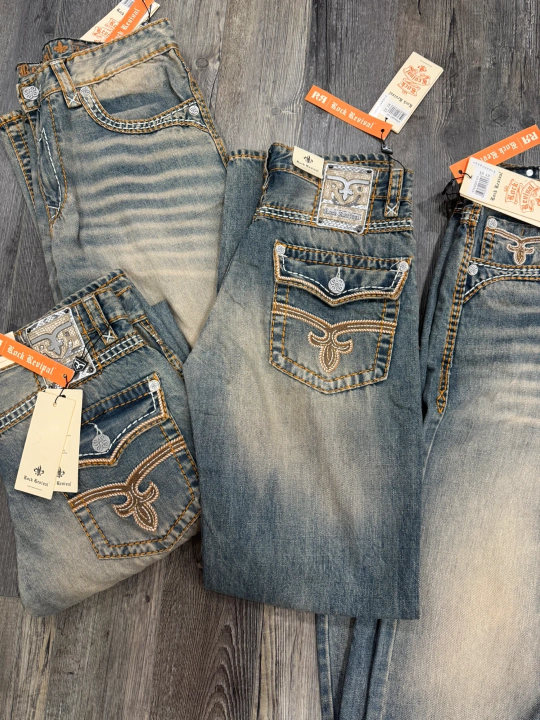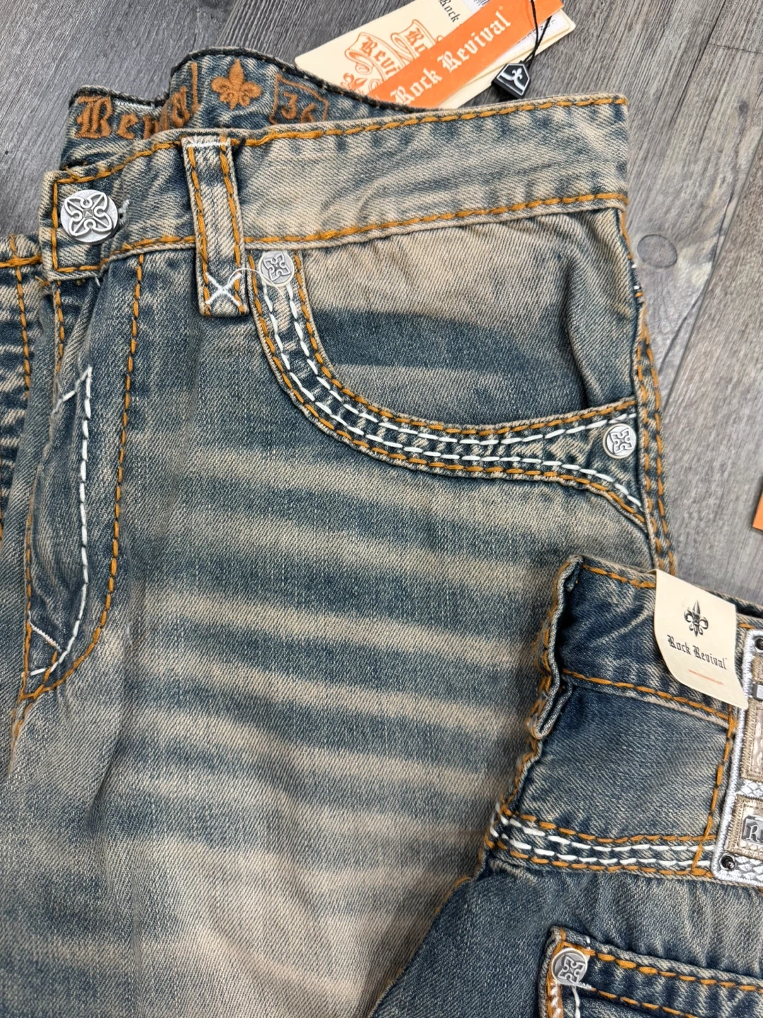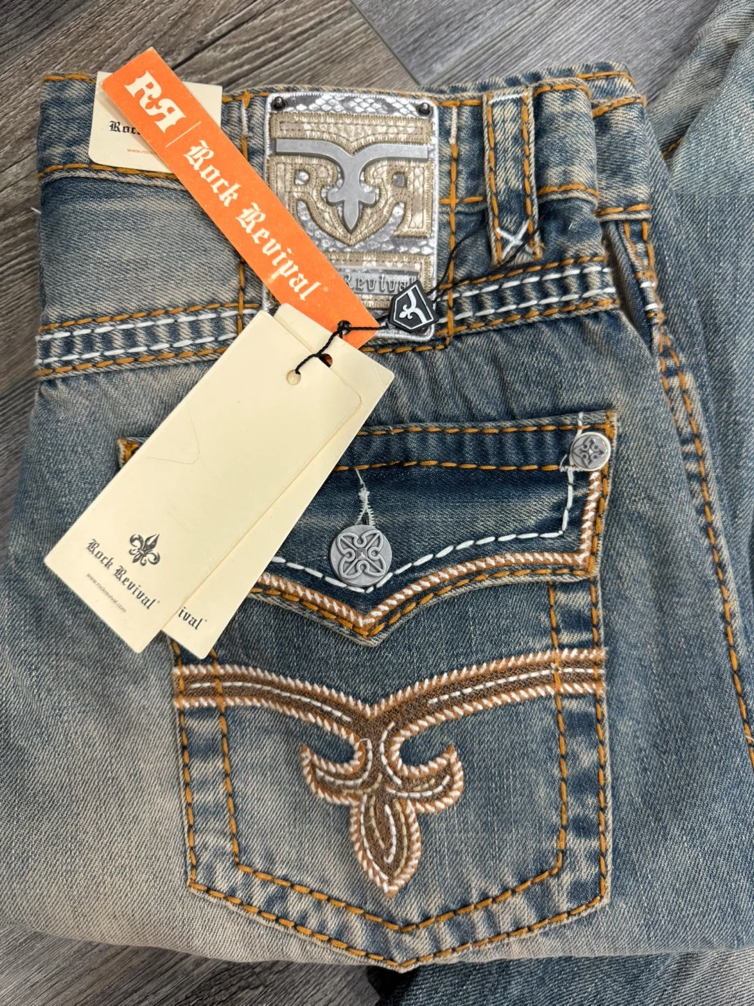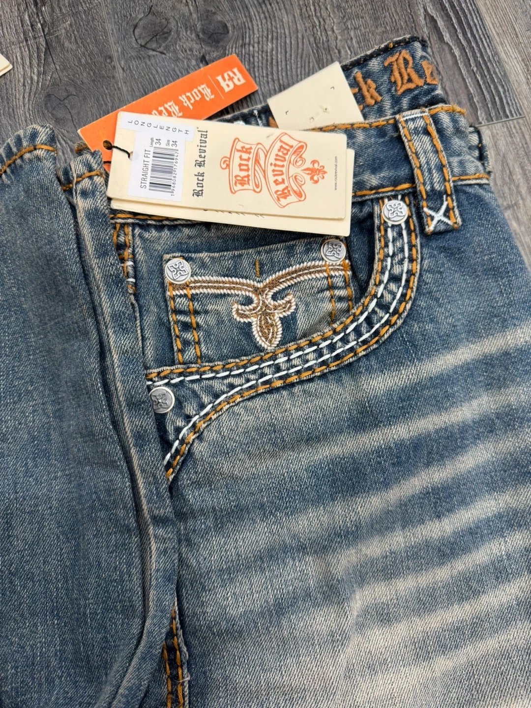 Rock Revival Straight Fit denim jeans with decorative stitching. Size30 to 36waist, 30 to 36inseam. These jeans feature a classic blue wash with subtle fading.