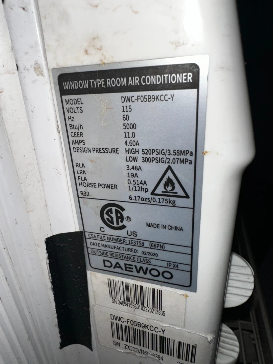Daewoo window unit air conditioner. Model DWC-F05B9KCC-Y. Cooling capacity 5000 Btu/h. Manufactured 02/2020. Includes original mounting hardware.