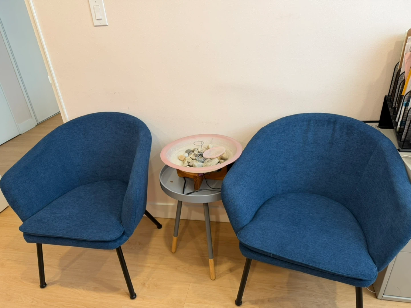 Set of two blue fabric upholstered barrel accent chairs. These chairs have a modern design with black metal legs and removable seat cushions. They're comfy and stylish for any room!