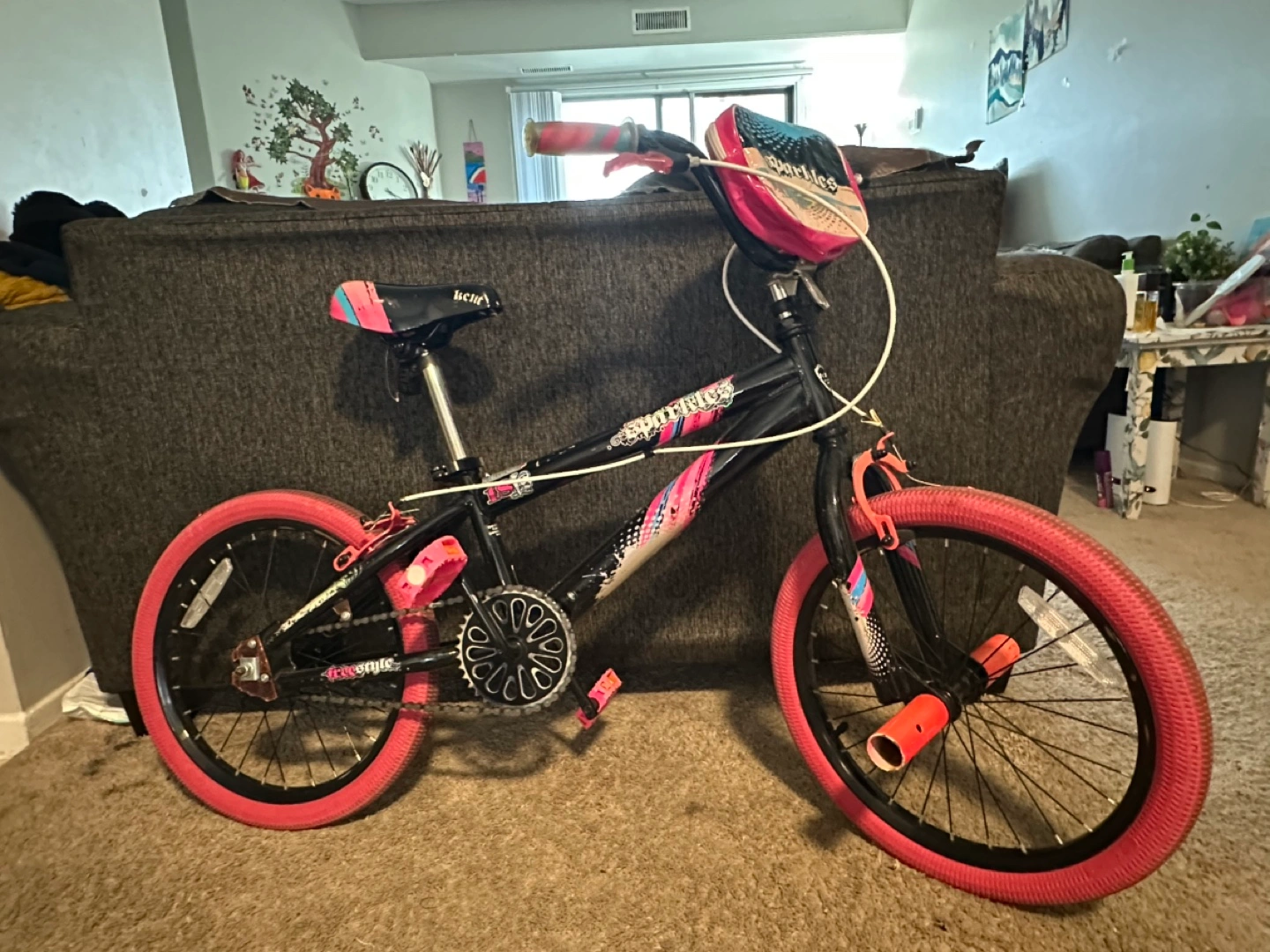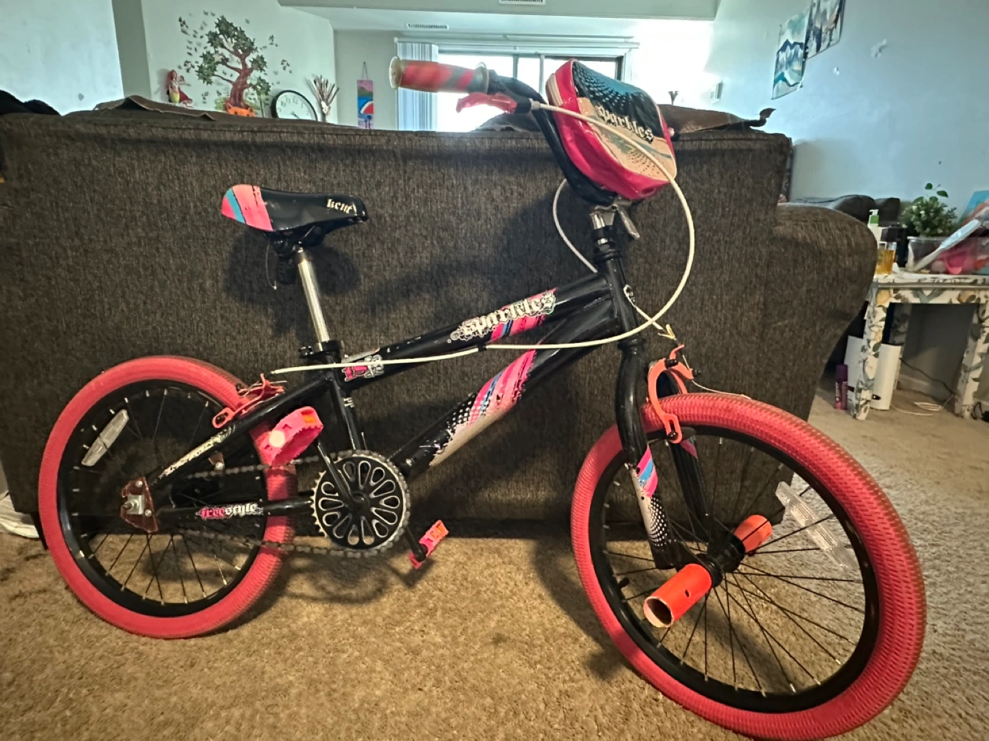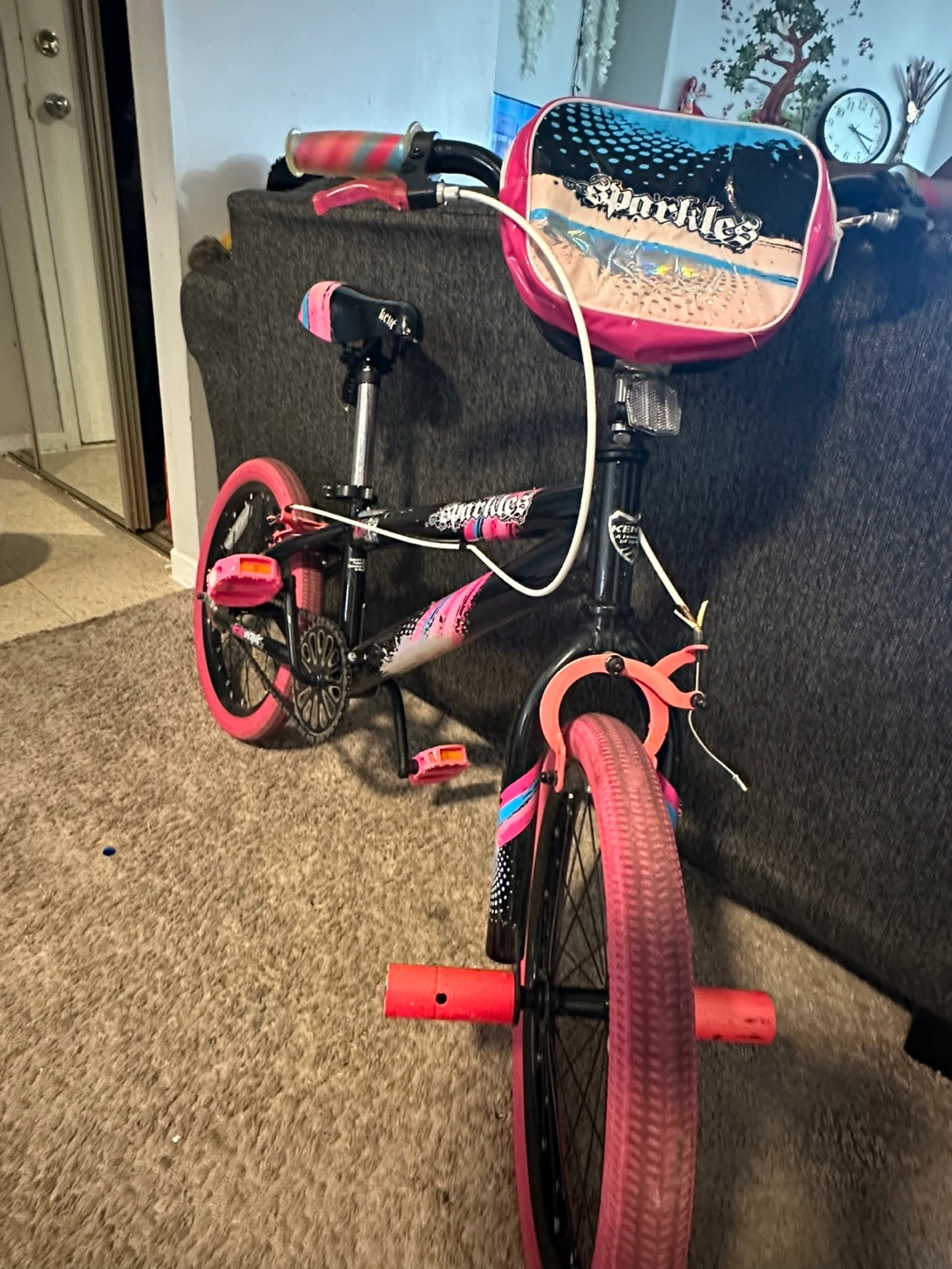 18 inch Black and pink girls' bike. Pink wheels and seat. Includes front handlebar bag. Used condition.