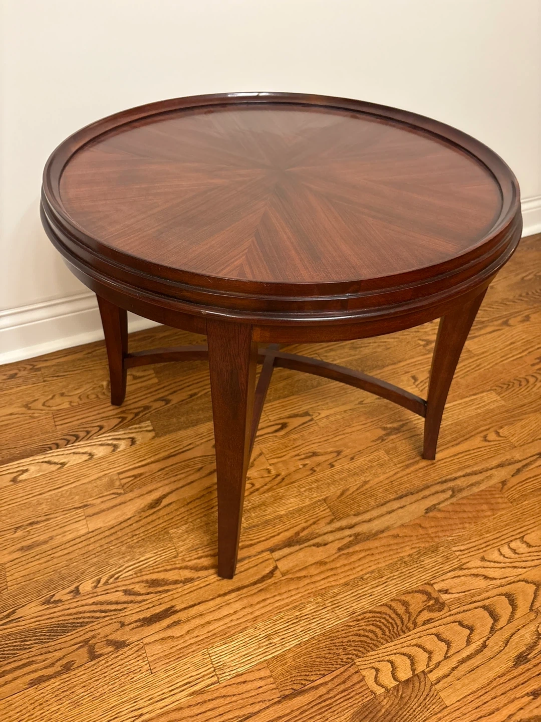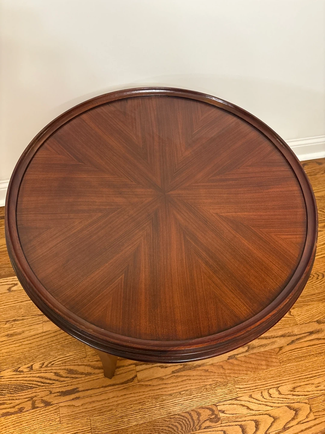 A lovely round side table crafted from rich mahogany wood. It features a beautiful sunburst inlay pattern on the top surface. The table's sturdy construction and elegant design make it a great addition to any room.