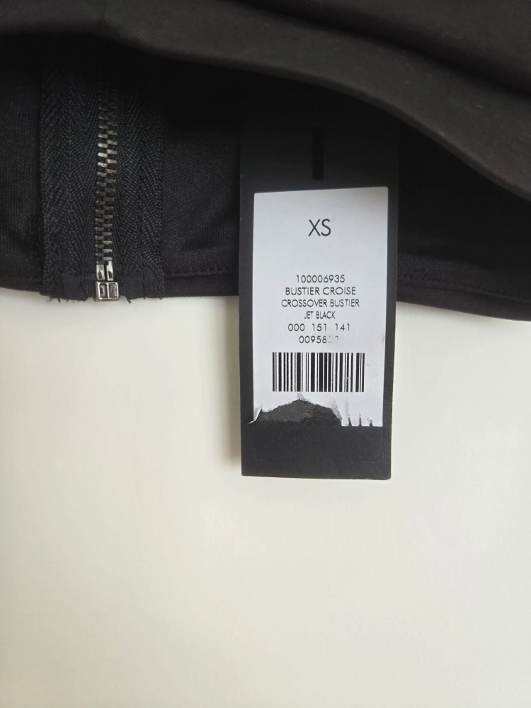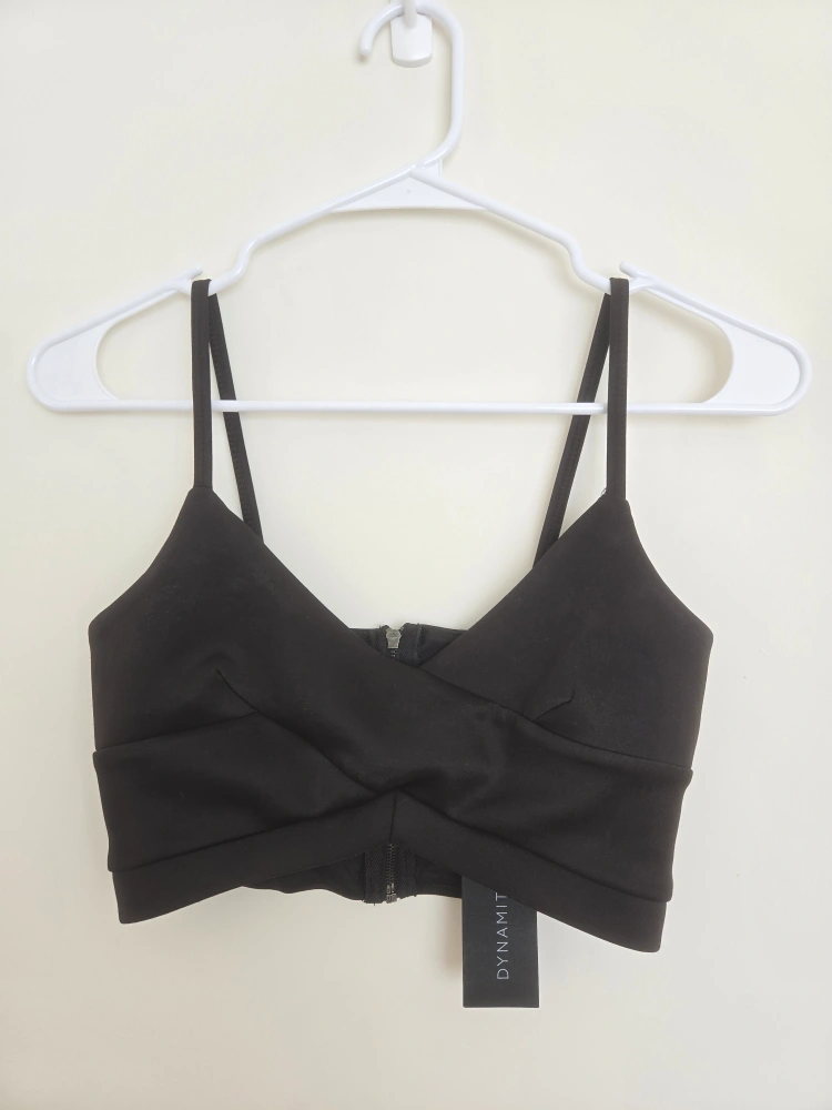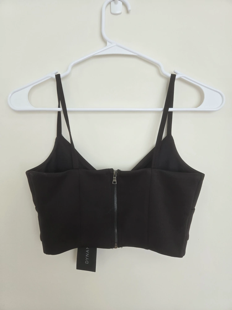 Black bustier top with adjustable straps. Features a front zipper closure and crossover design. This item will bring you joy when you wear it on a night out. Brand new with tags