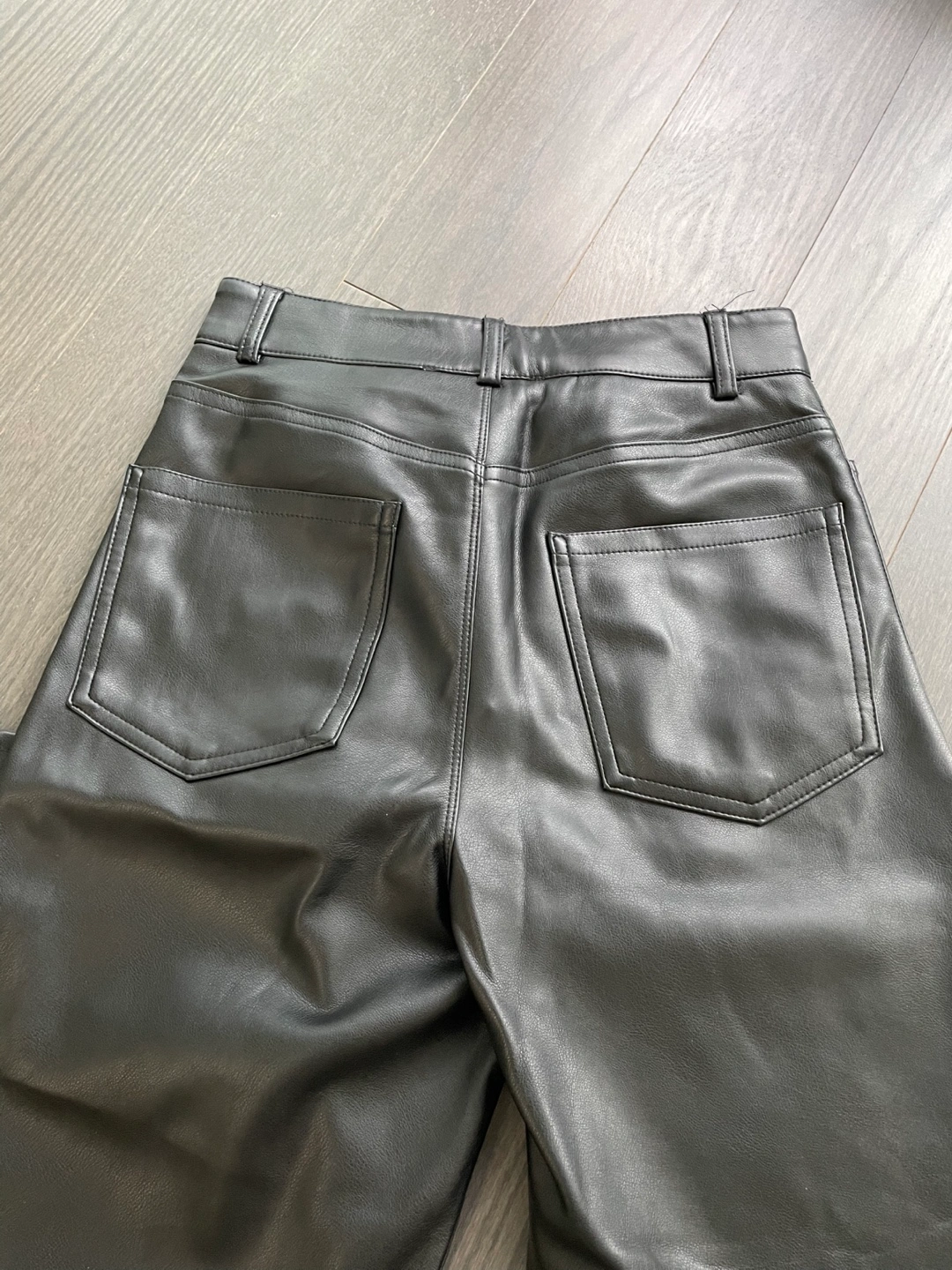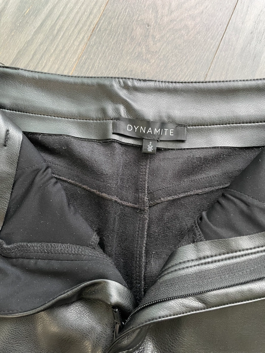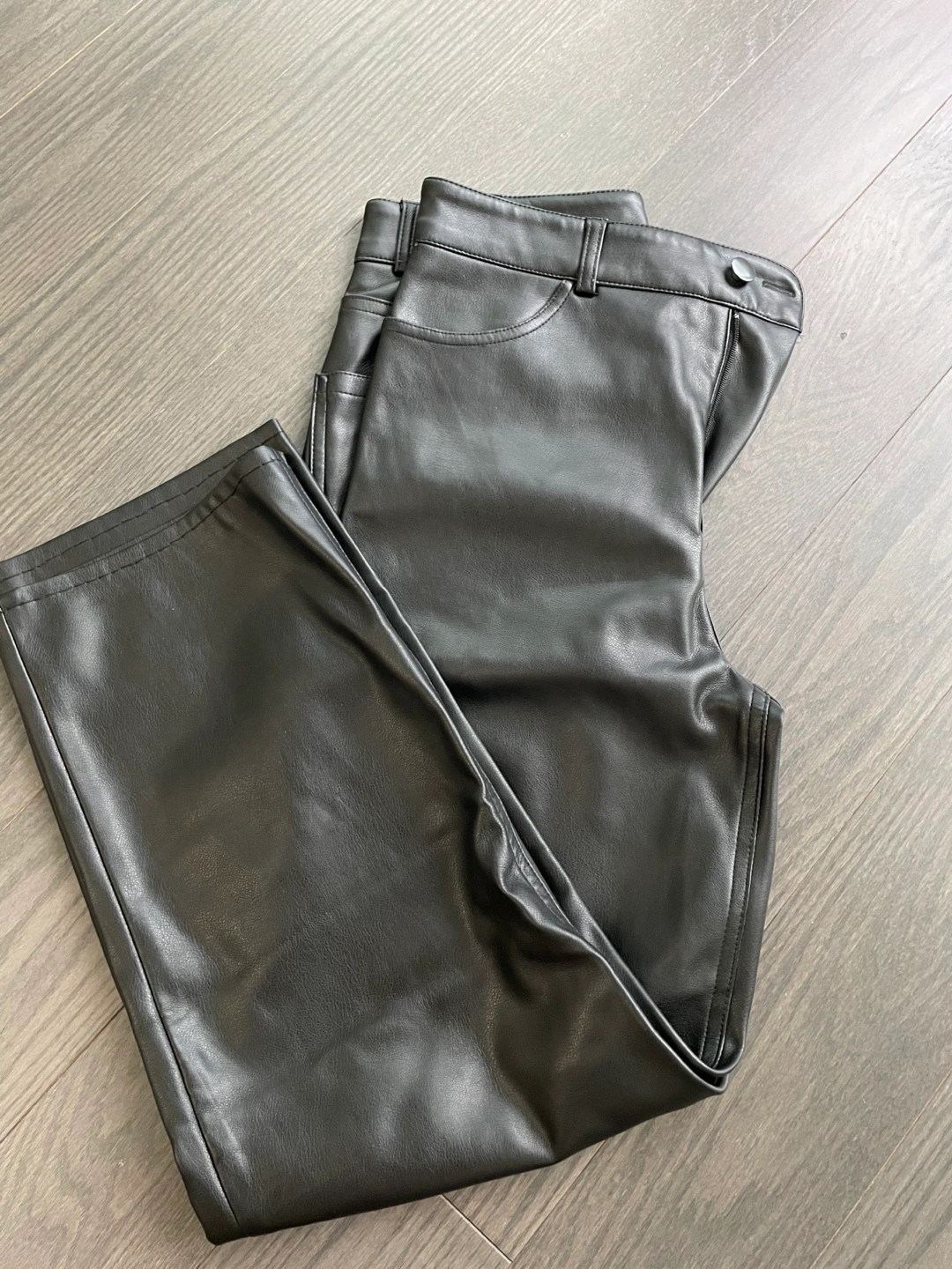 Black faux leather pants, straight leg Size 2, fits like a size 4 Has some stretch, is very comfortable Only worn a couple times