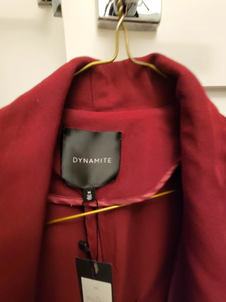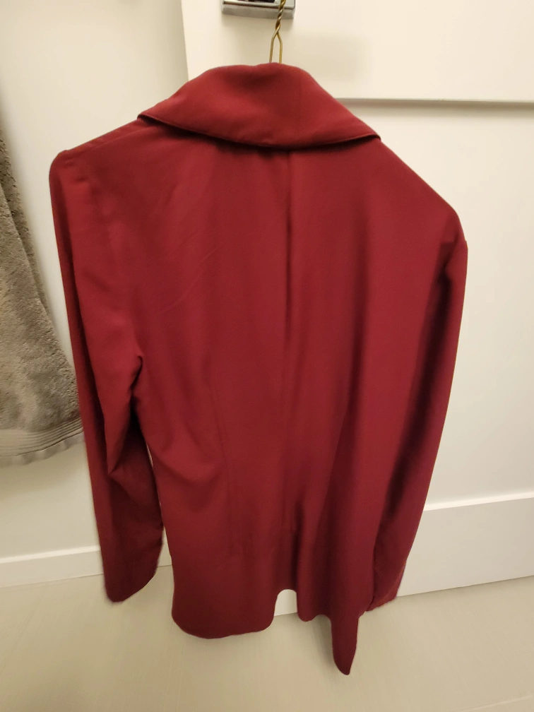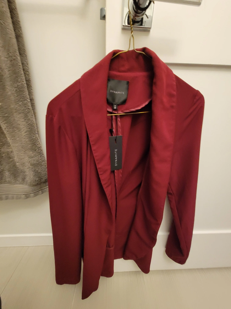 A burgundy blazer. Features long sleeves, a collar, and a front pocket. Lightweight perfect for spring and summer wear!