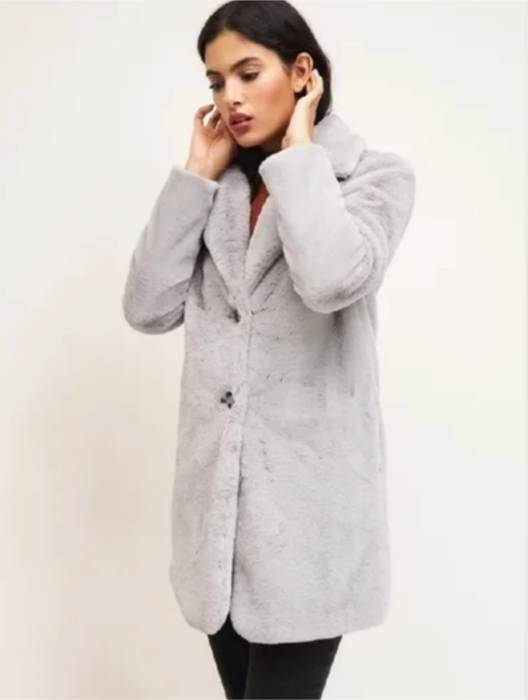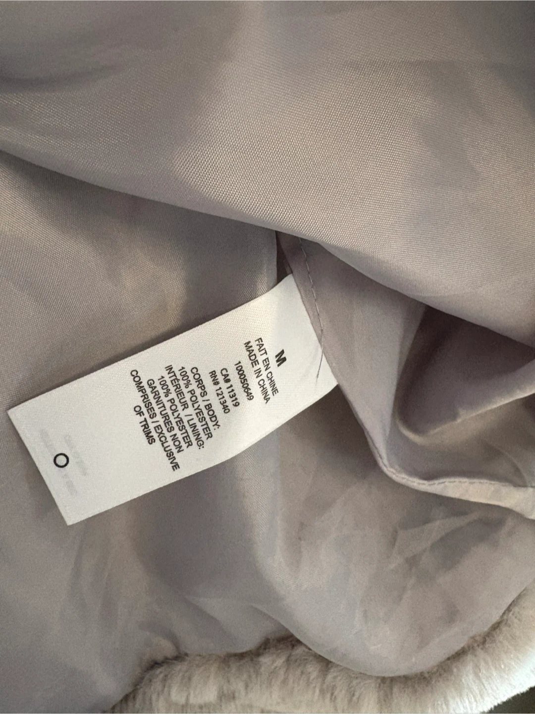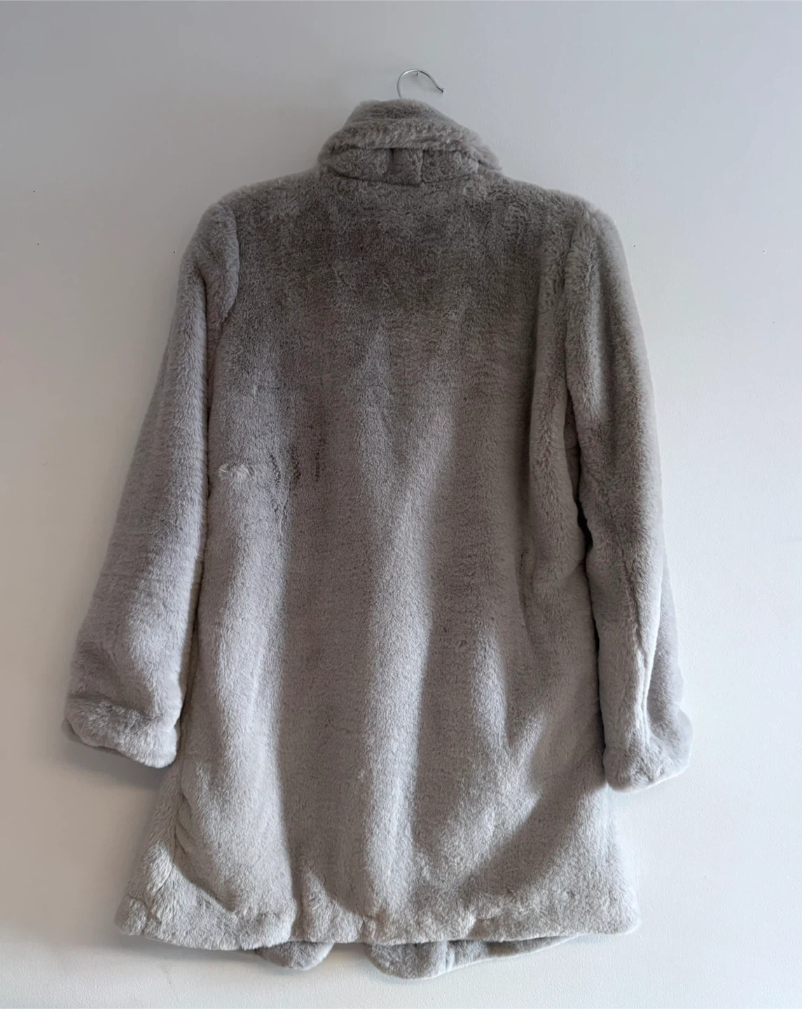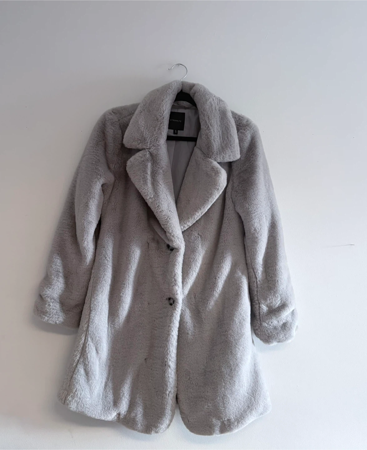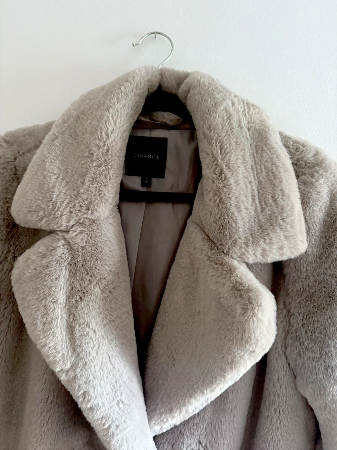 Selling a cozy Dynamite faux fur coat No pockets as I got it altered to size small Size mentioned in the coat is medium though More like oversized fit (small) It's a beautiful light grey colour and made of 100% polyester. Perfect for staying warm and stylish this winter Plush coat In excellent condition Never worn Price is firm Pick up only Cash only