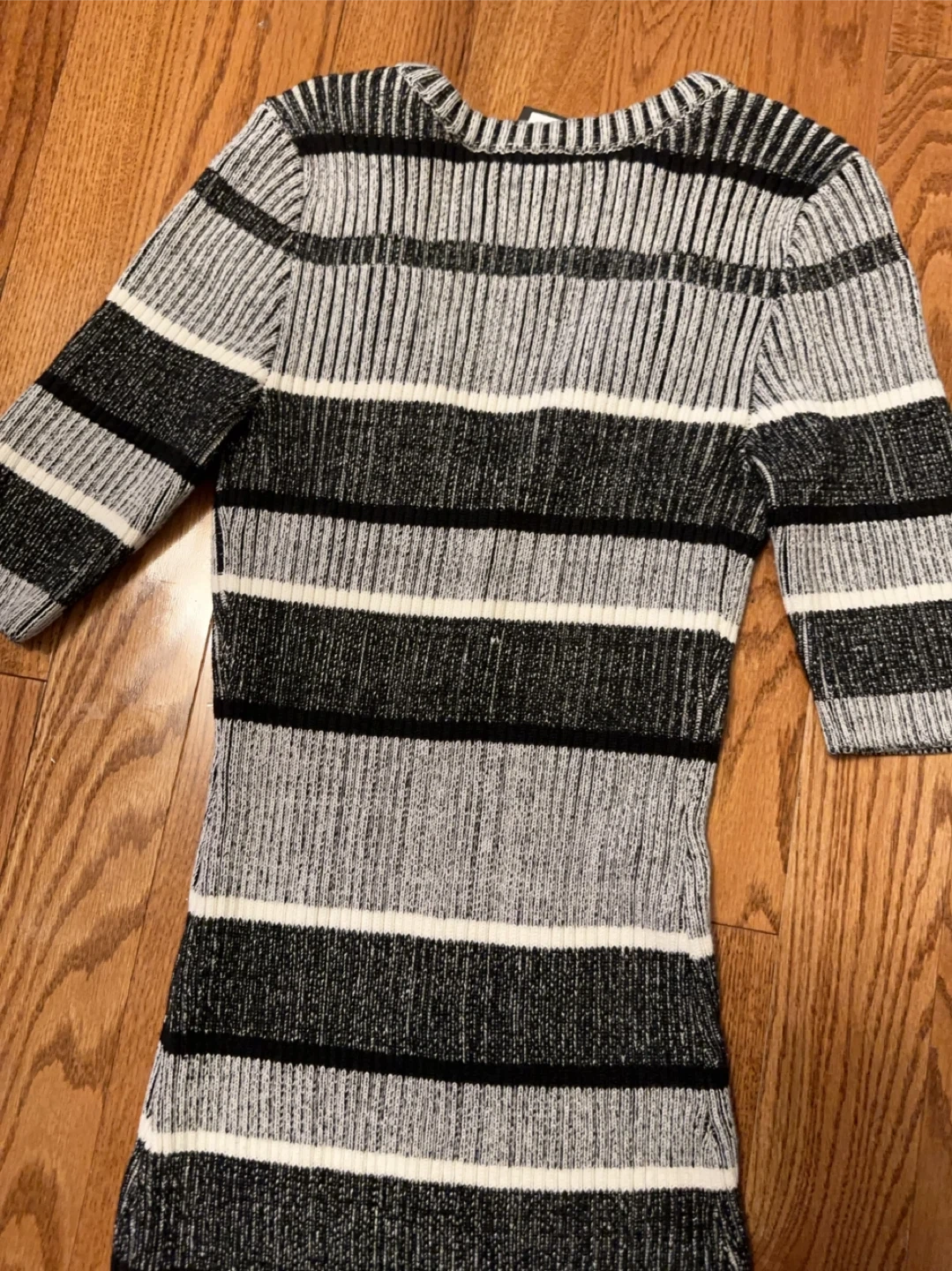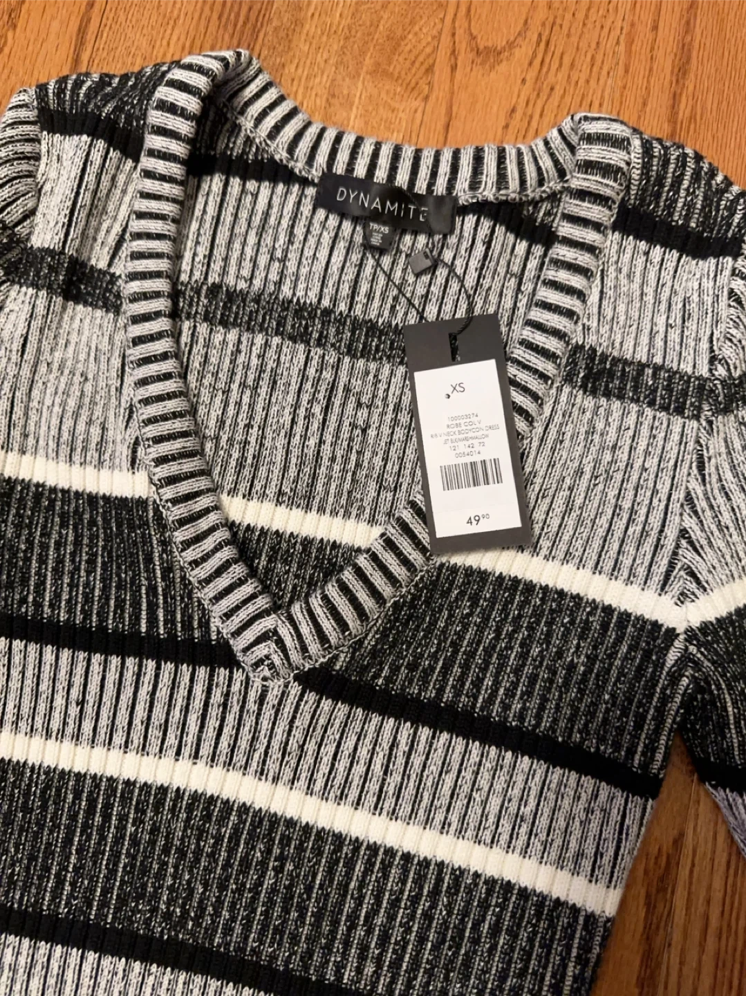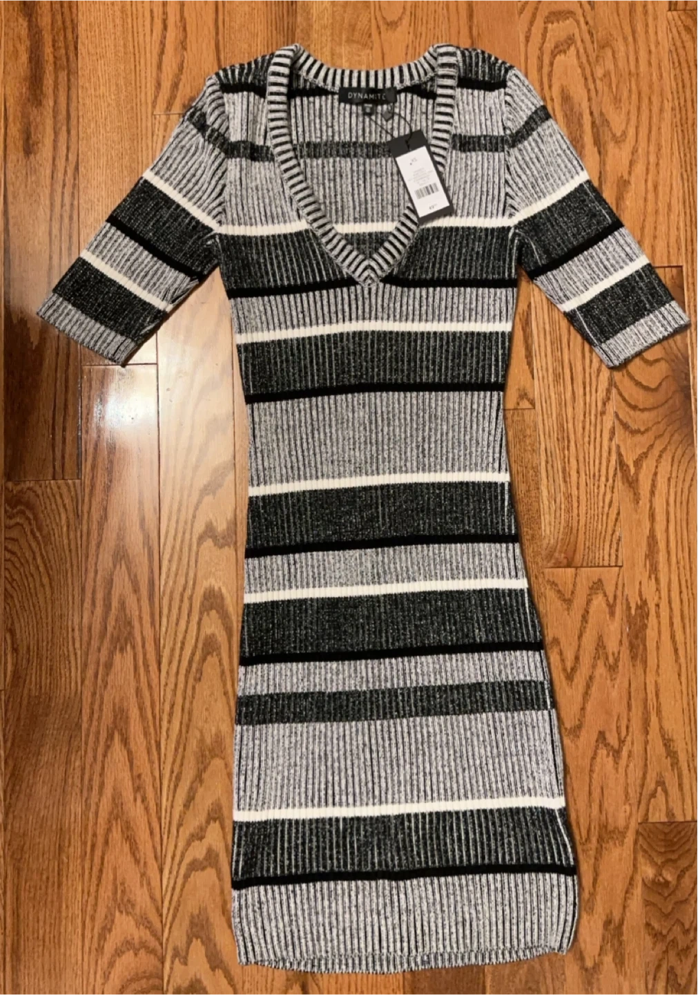 10This Dynamite dress features a stylish striped pattern in black, white, and grey. It's a size XS and is in new condition with tags still attached. Perfect for a casual or dressed-up look!