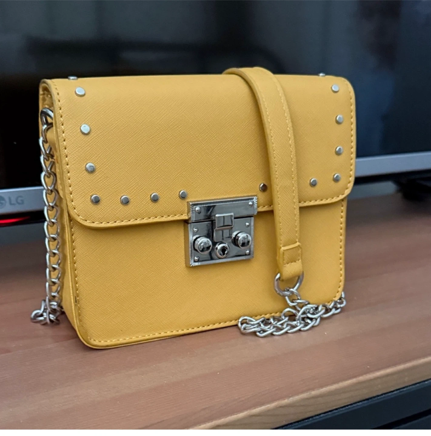 65A cute yellow bag with rivet details and a chain strap! It's perfect for adding a pop of colour to any outfit. Brand: Dynamite