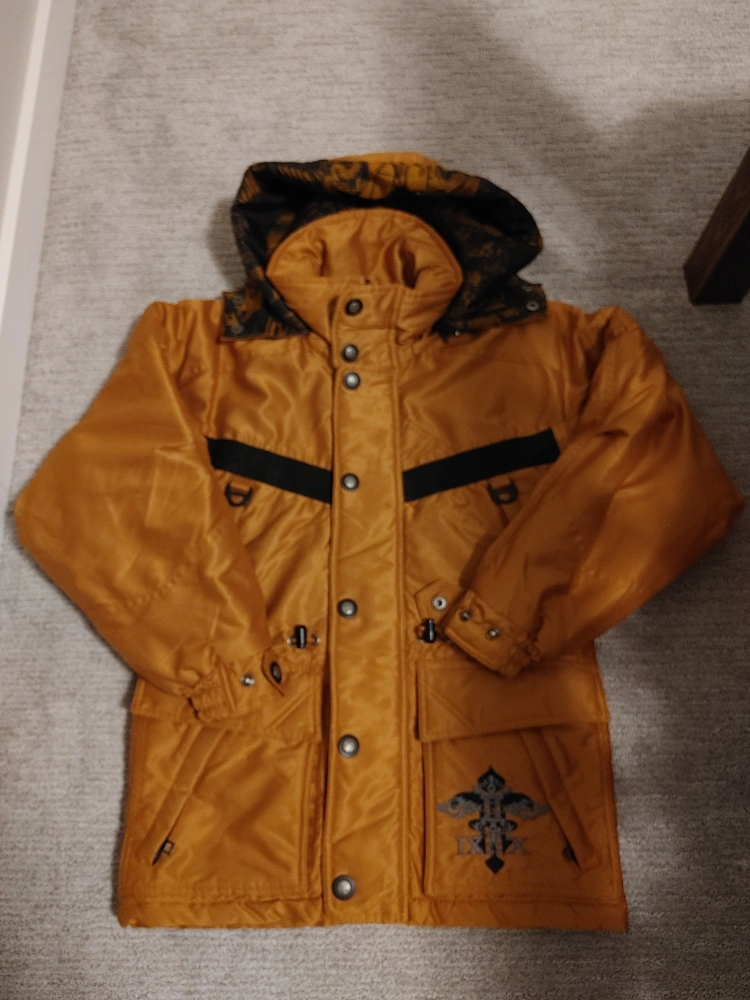 Mustard yellow winter jacket with black accents, black and gold hood, and Dyno logo. Button closure.