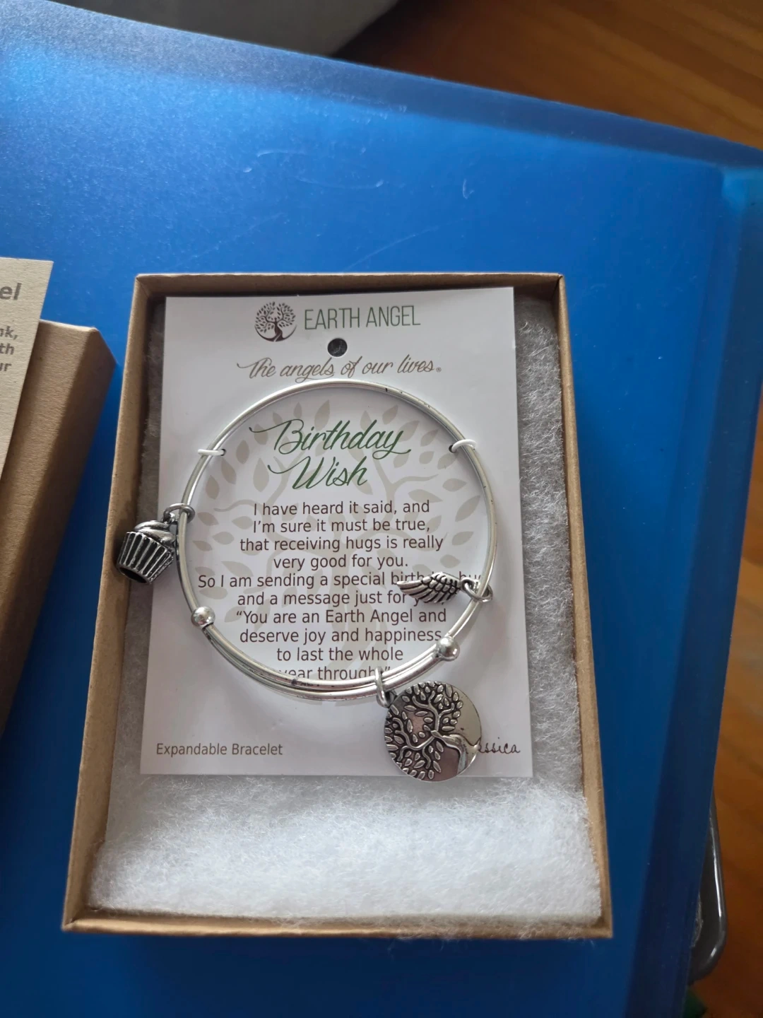This expandable bracelet from Earth Angel has a 'Birthday Wish' charm with a cupcake and tree of life design. It comes in its original box and is ready to bring joy. Makes a thoughtful birthday gift!