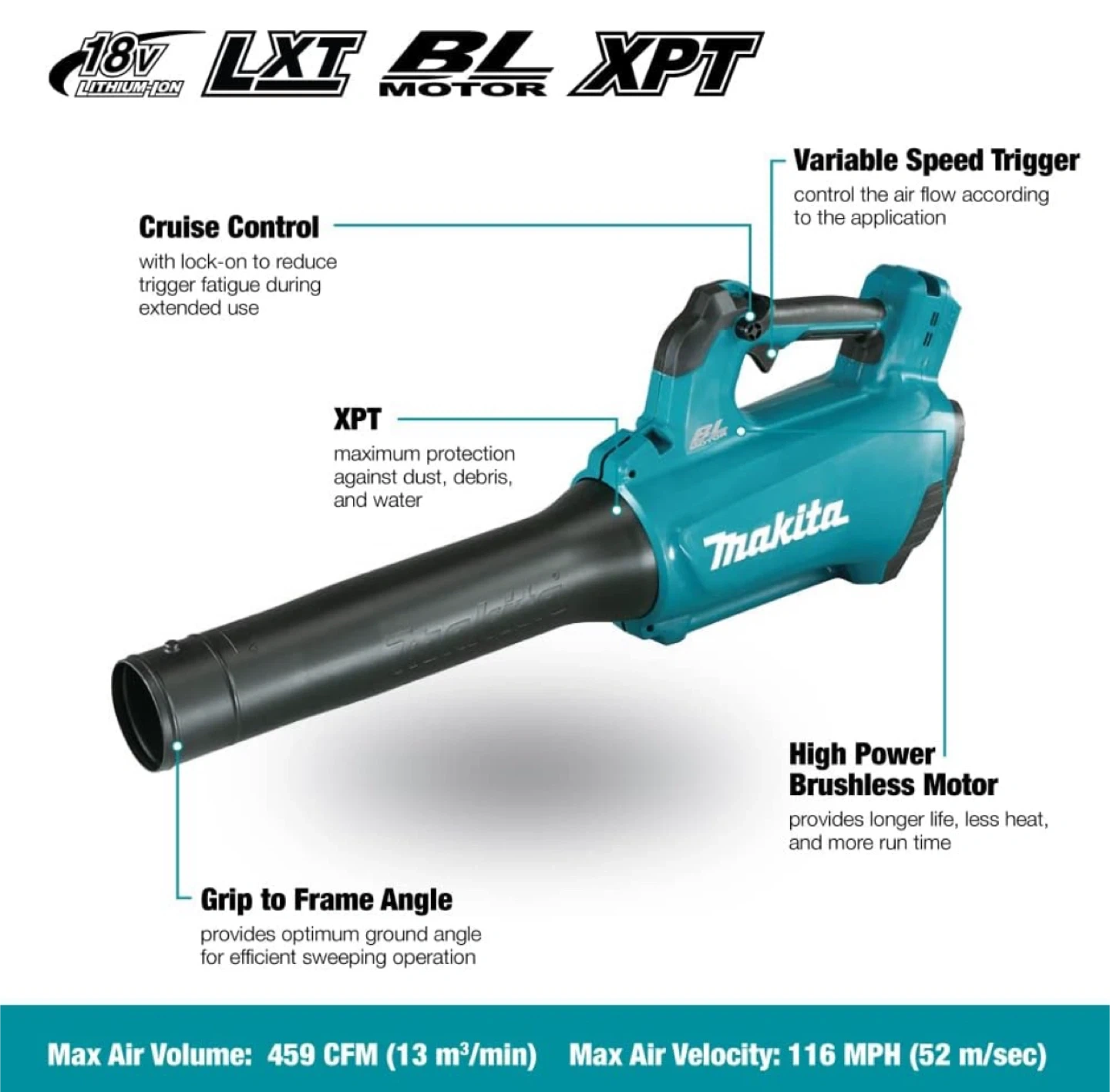 Quiet, lightweight and powerful blowing operation where noise levels are a concern. Our most powerful 18V cordless blower yet! Amazing 116 MPH and 459 CFM operation. Powered by one 18V Li-ion battery to supply energy to the powerful 18V DC motor drive system.