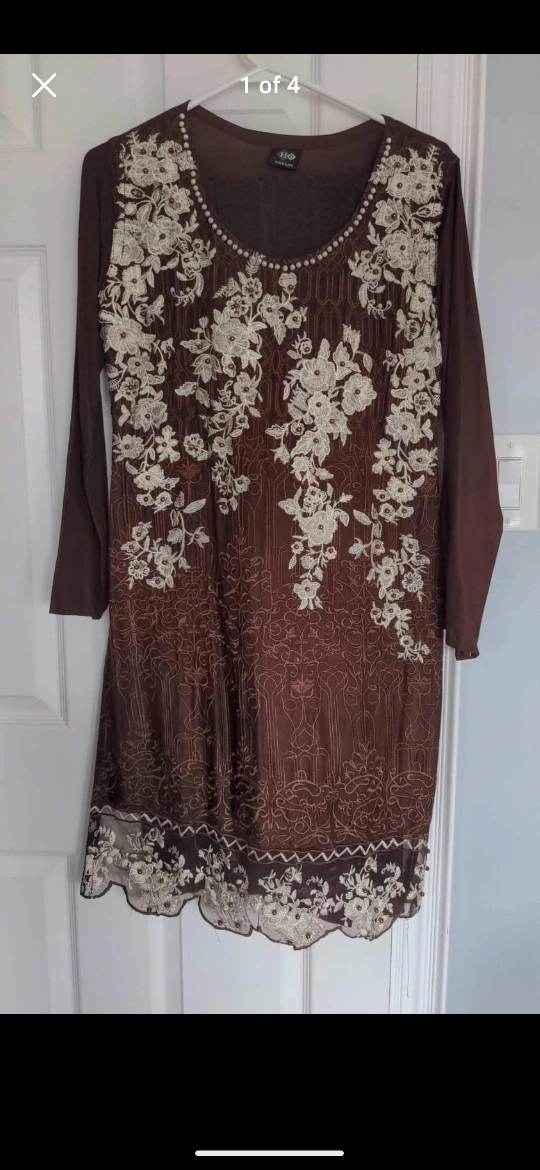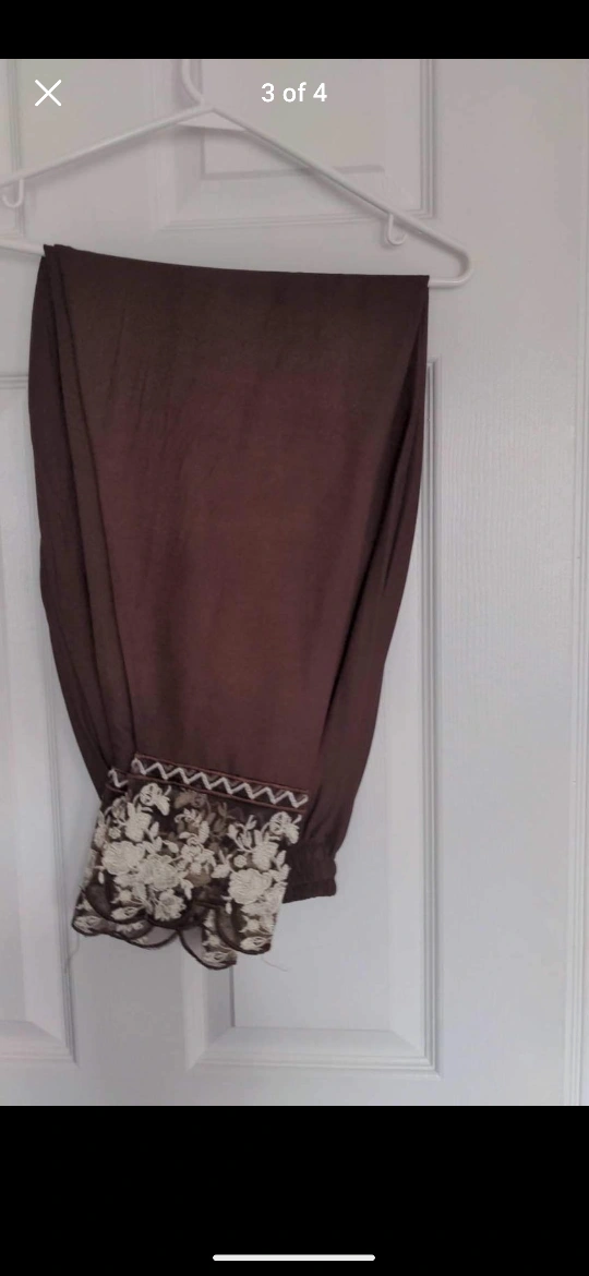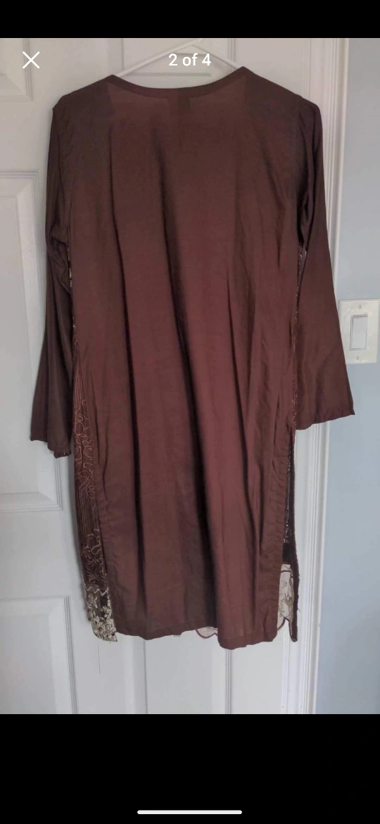 Here's a beautiful brown salwar kameez suit, perfect for a special occasion! It features lovely embroidery details and comes with matching pants and a dupatta. The size is medium.